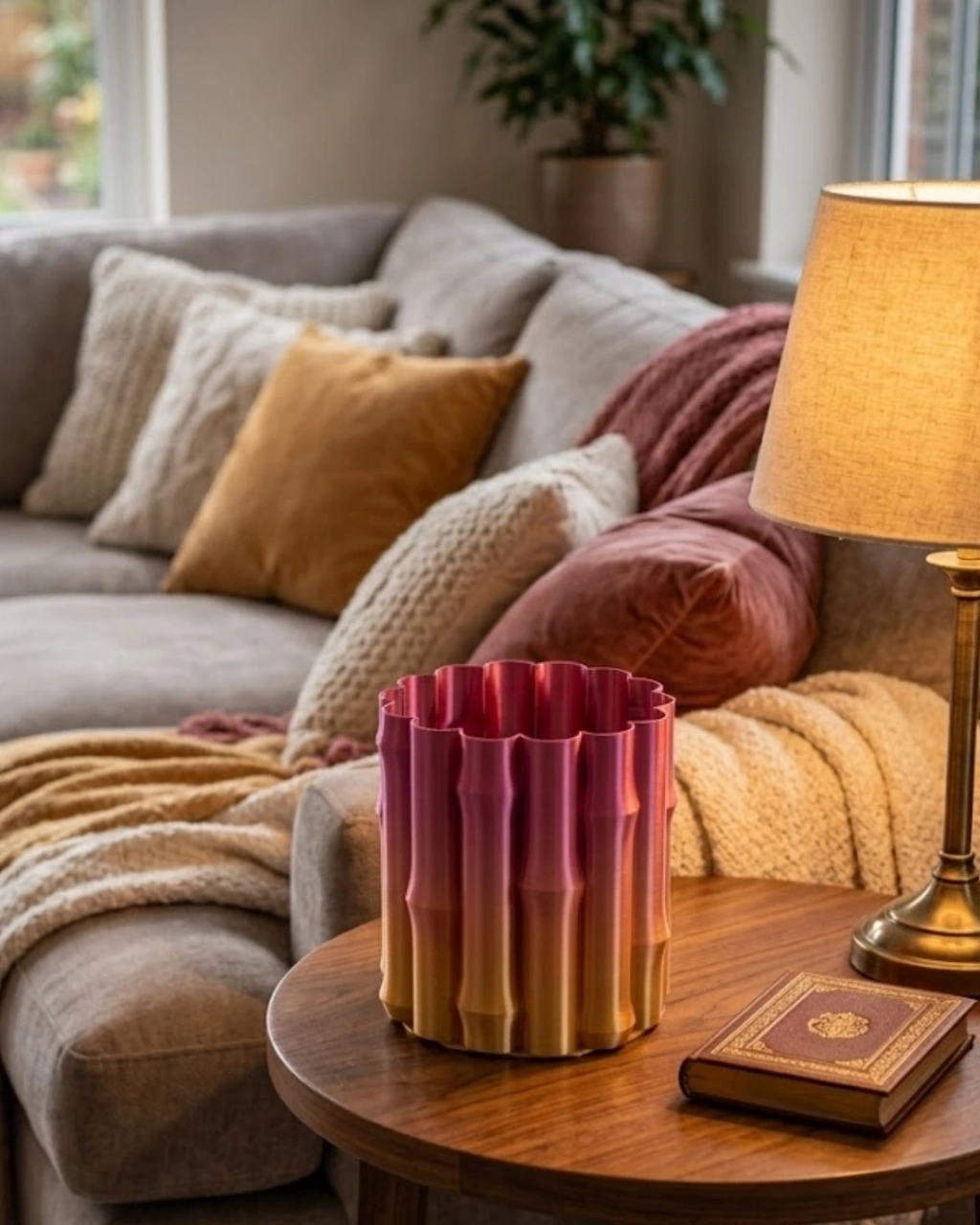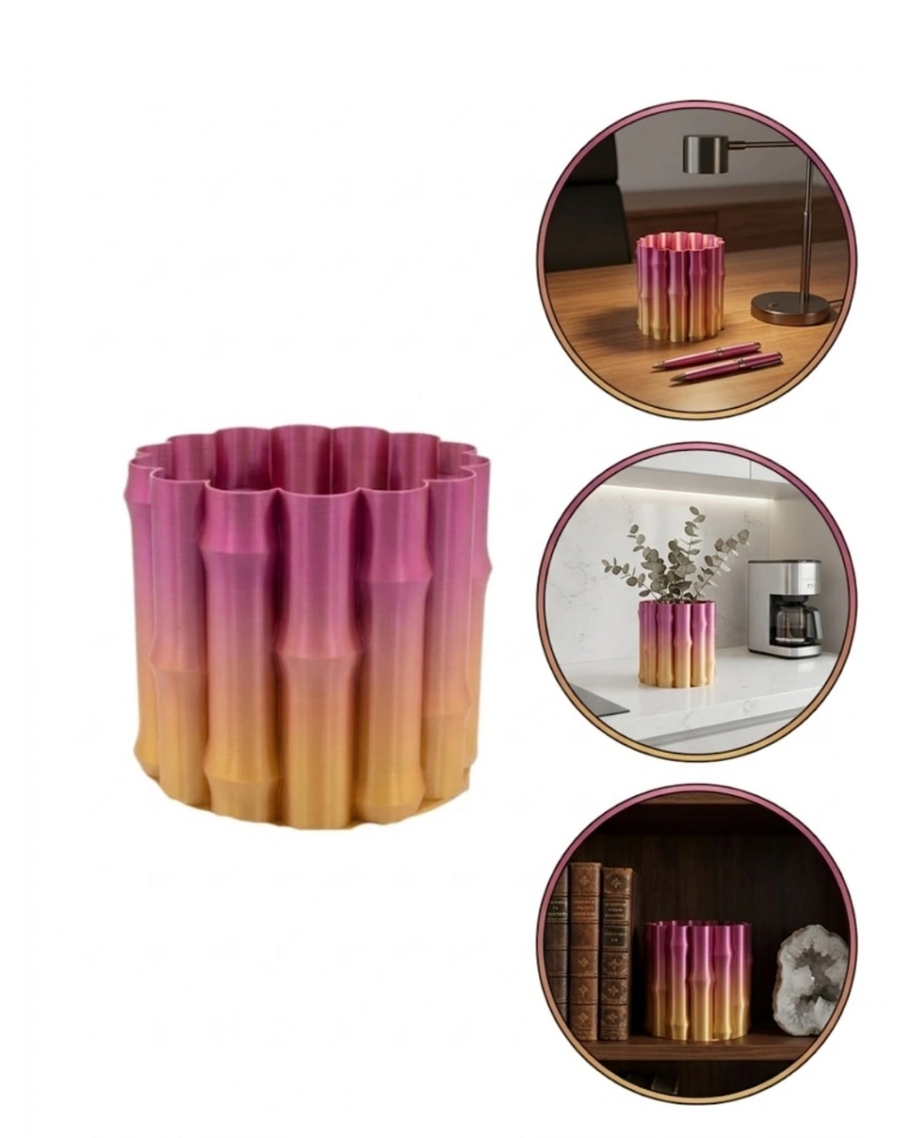 Şık ve modern bir yaşam alanı oluşturmak isteyenler için tasarlanan mor sarı degrade 3D vazo, dekorasyonunuza farklı bir boyut kazandırır. Özgün kıvrımlı yapısı ve dikkat çekici renk geçişi sayesinde bulunduğu ortamda odak noktası haline gelir.Es tasarımının yanı sıra fonksiyonel kullanımı ile de öne çıkar. İster çiçeklerle ister tek başına dekoratif obje olarak kullanılabilir. Modern, bohem ve çağdaş dekorasyon tarzlarına uyum sağlayarak yaşam alanlarınıza uyumlu bir bütünlük sunar.Kaliteli ve dayanıklı yapısı sayesinde uzun süreli kullanım sağlar. Ev, ofis, kafe veya stüdyo gibi farklı alanlarda tercih edilebilir. Aynı zamanda sevdiklerinize şık ve farklı bir hediye alternatifi olarak da değerlendirilebilir.