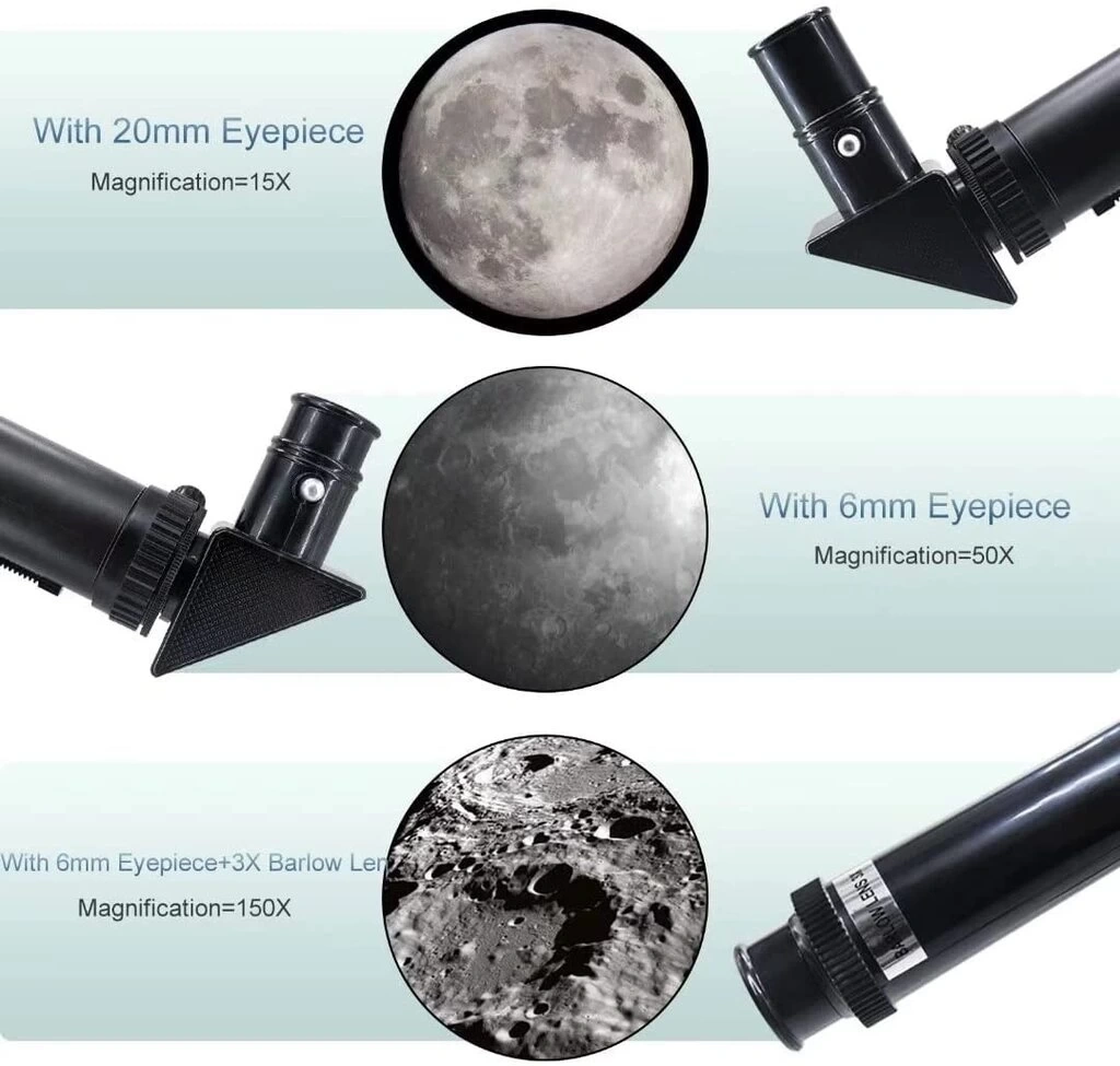 • Yüksek Büyütme: 2 göz merceği (H20mm ve H6mm) ve 3X Barlow lens ile donatılmış teleskop. 3x Barlow lens, her bir göz merceğinin büyütme gücünü üç katına çıkarır, böylece çocuklar 15X'ten 150X'e büyütme elde edebilir. İster gezegenleri ister ayı izliyor olsun, teleskopumuz yetişkinler ve çocuklar için en iyi yardımcıdır. 812 yaş arası yetişkinler ve çocuklar ve astronomiye yeni başlayanlar için harika bir teleskop.