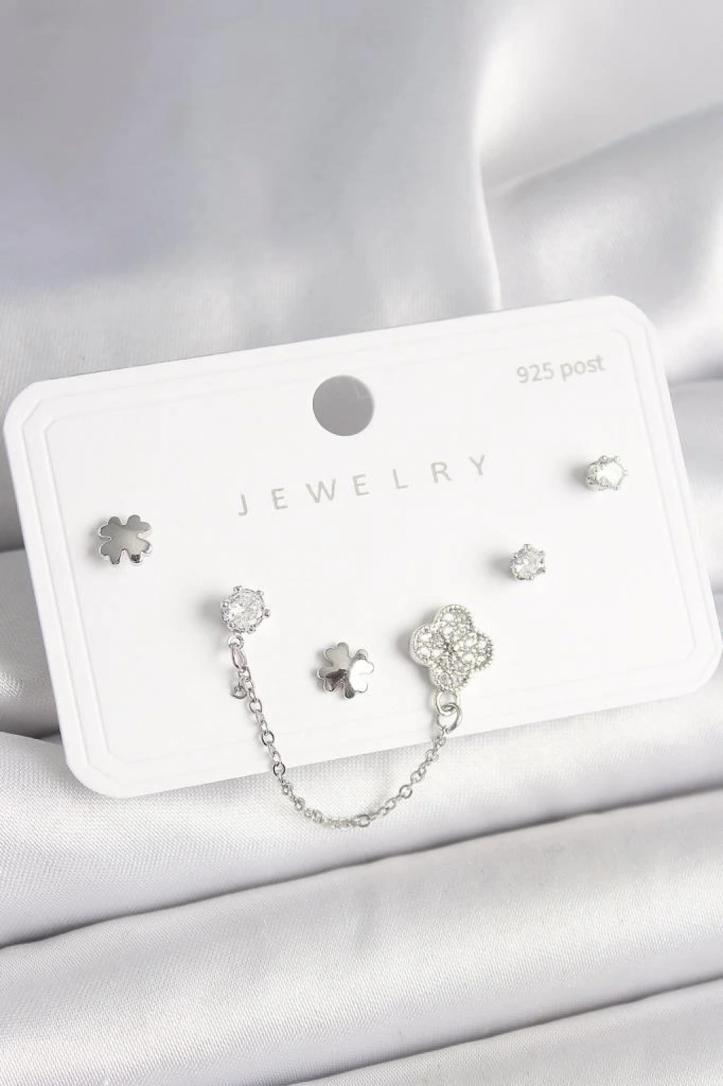 925 Ayar Gümüş Çivi Pirinç Gümüş Renk Zirkon Taşlı Yonca Model Sallantı Zincir Detay Kadın Küpe Seti - BKP10400 (599599)