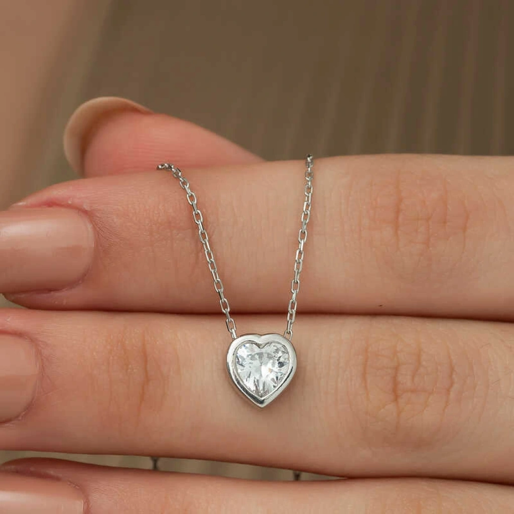 Kalp simgesi daima koşulsuz sevginin ve aşkın sembolü olmuştur. Dini öğretilerde ise kalbin gücü sınırsızdır. Çünkü kalp Yaratanın evi, bizim ise evrene açılan gerçeklik kapımızdır. Bu şık gümüş kalp kolye; doğum günü hediyesi, sevgililer günü hediyesi veya annelere hediye olarak özel günlerde tercih edilebilecek mükemmel bir seçenektir. Gümüş kalp bayan kolye 925 ayar gümüşten imal edilmiştir. Bu kolye üzerinde rodyum kaplama yapılmıştır. Rodyum kaplama yapılan gümüş kolye modelleri parlaklığını uzun süre muhafaza eder. Üzerinde bulunan taş zirkondur. Tüm gümüş kolye modellerimizde olduğu gibi gümüş kalp kolye modeli de el emeği ile üretilmiştir. Gümüş ve değerli taşlar nedeniyle belirtilen ortalama ürün ağırlığında ± %10 sapma olabilmektedir.