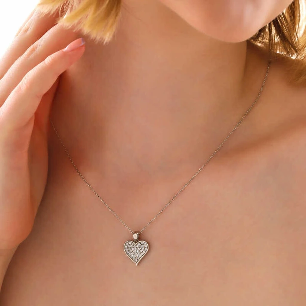 Kalp simgesi daima koşulsuz sevginin ve aşkın sembolü olmuştur. Dini öğretilerde ise kalbin gücü sınırsızdır. Çünkü kalp Yaradanın evi, bizim ise evrene açılan gerçeklik kapımızdır. Bu şık gümüş kalp kolye; doğum günü hediyesi, sevgililer günü hediyesi veya annelere hediye olarak özel günlerde tercih edilebilecek mükemmel bir seçenektir. Gümüş kalp kadın kolye 925 ayar gümüşten imal edilmiştir. Bu kolye üzerinde rodyum kaplama yapılmıştır. Rodyum kaplama yapılan gümüş kadın kolye modelleri parlaklığını uzun süre muhafaza eder. Üzerinde bulunan taşlar zirkondur. Tüm gümüş kadın kolye modellerimizde olduğu gibi gümüş kalp kadın kolye modeli de el emeği ile üretilmiştir. Gümüş ve değerli taşlar nedeniyle belirtilen ortalama ürün ağırlığında ± %10 sapma olabilmektedir.