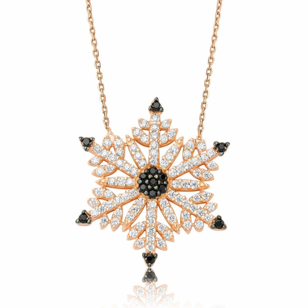 Kadınların ışıltısı, berraklığı kar tanesine benzetilip özel olarak tasarlanmıştır. Kar tanelerinin her birinin bayanlar gibi eşsiz ve ayrı kıymette olması onları özel kılan bir diğer özelliktir. Asilliği her dönemde dikkat çekmeyi başarmıştır. Bunun yanında insanların tıpkı kar taneleri gibi birbirlerine zarar vermeden de mutlu bir şekilde yaşayabileceklerini sembolize etmektedir. Bu şık kolye; doğum günü hediyesi, sevgililer günü hediyesi veya annelere hediye olarak özel günlerde tercih edilebilecek mükemmel bir seçenektir. Kolye, 925 ayar gümüşten imal edilmiştir. Gümüş üzerine rose kaplama yapılmıştır. Rose altın kaplama yapılan gümüş bayan kolye modelleri parlaklığını uzun süre muhafaza eder, gümüşü pembe renge dönüştürür ve oksitlenmesi gecikir. Zincir boyu ortalama 45 cm'dir. Tüm gümüş bayan kolye modellerinde olduğu gibi bu gümüş kar tanesi bayan kolye de tamamı el emeği ile üretilmiştir. Gümüş ve değerli taşlar nedeniyle belirtilen ortalama ürün ağırlığında ± %10 sapma olabilmektedir.