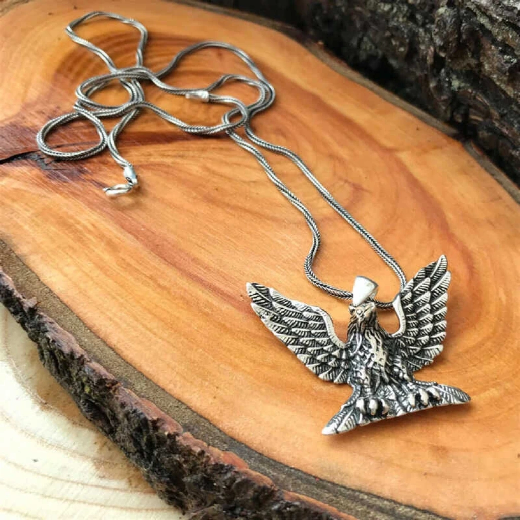 Kuşların kralı olan ve savaşmak üzere dünyaya inen kartal, özellikle savaşçı ve güçlü olmasıyla tanınır; bu yüzden pek çok ulusun sembolü olmuştur. Bu derin anlamdan esinlenerek oluşturulan kartal erkek kolye; kendinize yada sevdiklerinize doğum gününde, babalar gününde yada özel günlerde hediye edebilirsiniz. Bu şık erkek kolye; 925 ayar gümüşten imal edilmiştir. Gümüş üzerine oksit kaplama yapılmıştır. Oksit kaplama yapılan kolyeler parlaklığını uzun süre muhafaza eder. Tüm erkek kolyelerde olduğu gibi gümüş kartal erkek kolye de el emeği ile üretilmiştir. Gümüş ve değerli taşlar nedeniyle belirtilen ortalama ürün ağırlığında ± %10 sapma olabilmektedir.