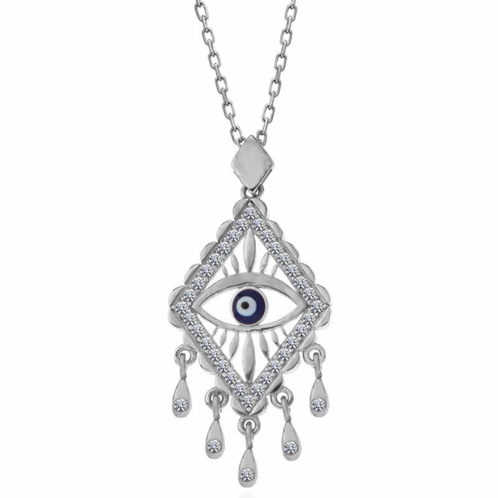 Birçok kültürde kötü enerjinin zararlarından korunmak için çeşitli tılsımlar kullanılmıştır. Doğu kültürlerinin çoğunda kullanılan tılsım ise gözdür. Nazar boncuğu da göz şeklinden ilham alınarak tasarlanmıştır. Mavi rengin seçilmesi de tesadüf değildir. Renkli gözlü kişilerin enerjisini daha etkili yansıttığı inancı gereği nazar boncukları çoğunlukla mavi olarak tasarlanır. Güzelliğiyle göz kamaştıran, nazardan korunmasını istediğiniz kişilere ve sevdiklerinize gümüş nazarlı göz kolyeyi armağan edebilirsiniz. Gümüş kolye üzerinde rodyum kaplama yapılmıştır. Rodyum kaplama yapılan gümüş kadın kolyeler parlaklığını uzun süre muhafaza eder, oksitlenmesi gecikir. Gümüş olan zincir boyu ortalama 45 cm'dir. Ürünlerimizin tamamı el emeği ile üretilmiştir. Gümüş ve değerli taşlar nedeniyle ürün ağırlığında ± %10 sapma olabilmektedir.