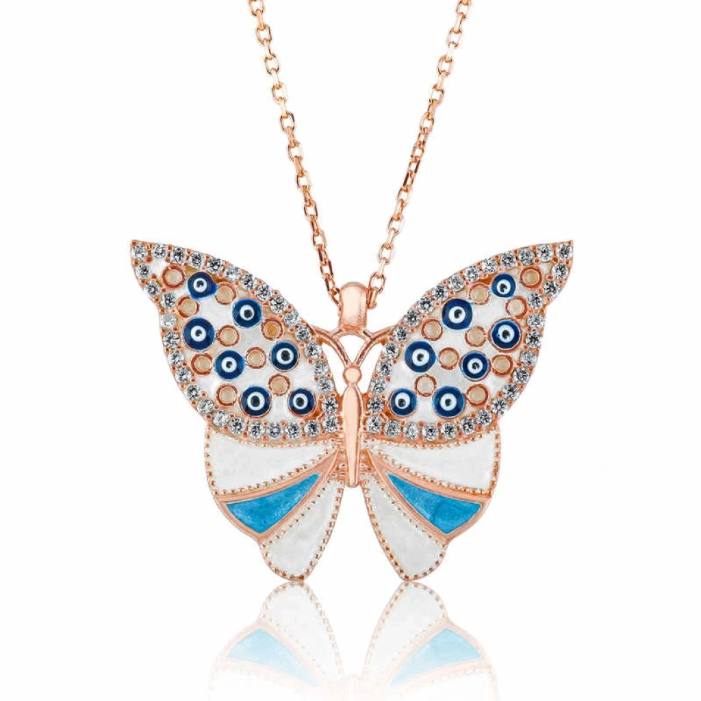 Özgürlüğü masumiyeti ve saflığı simgeleyen kelebekler, tertemiz sevginin ve aşkın ifadesidir. Bahar kelebekleri kolye anlam itibari ile aşkın küçük bir kıvılcım ile başladığı daha sonra büyük bir sabır ile büyüdüğü ve en sonunda ilan-ı aşkı ifade eder. Sizin olduğu kadar sevdiklerinizin de keyifle takacağı gümüş nazarlı kelebek kolye en güzel hediyelerden biri olacaktır. Bu şık kolye modeli üzerine rose altın kaplama yapılmıştır. Rose altın kaplama yapılan gümüş kolye modelleri parlaklığını uzun süre muhafaza eder, gümüşe pembe rengine çevirir ve oksitlenmeyi geciktirir. Üzerinde bulunan taşlar zirkondur. Tüm gümüş kolye modellerinde olduğu gibi gümüş nazarlı kelebek kolye modeli de el emeği ile üretilmiştir. Gümüş ve değerli taşlar nedeniyle belirtilen ortalama ürün ağırlığında ± %10 sapma olabilmektedir.