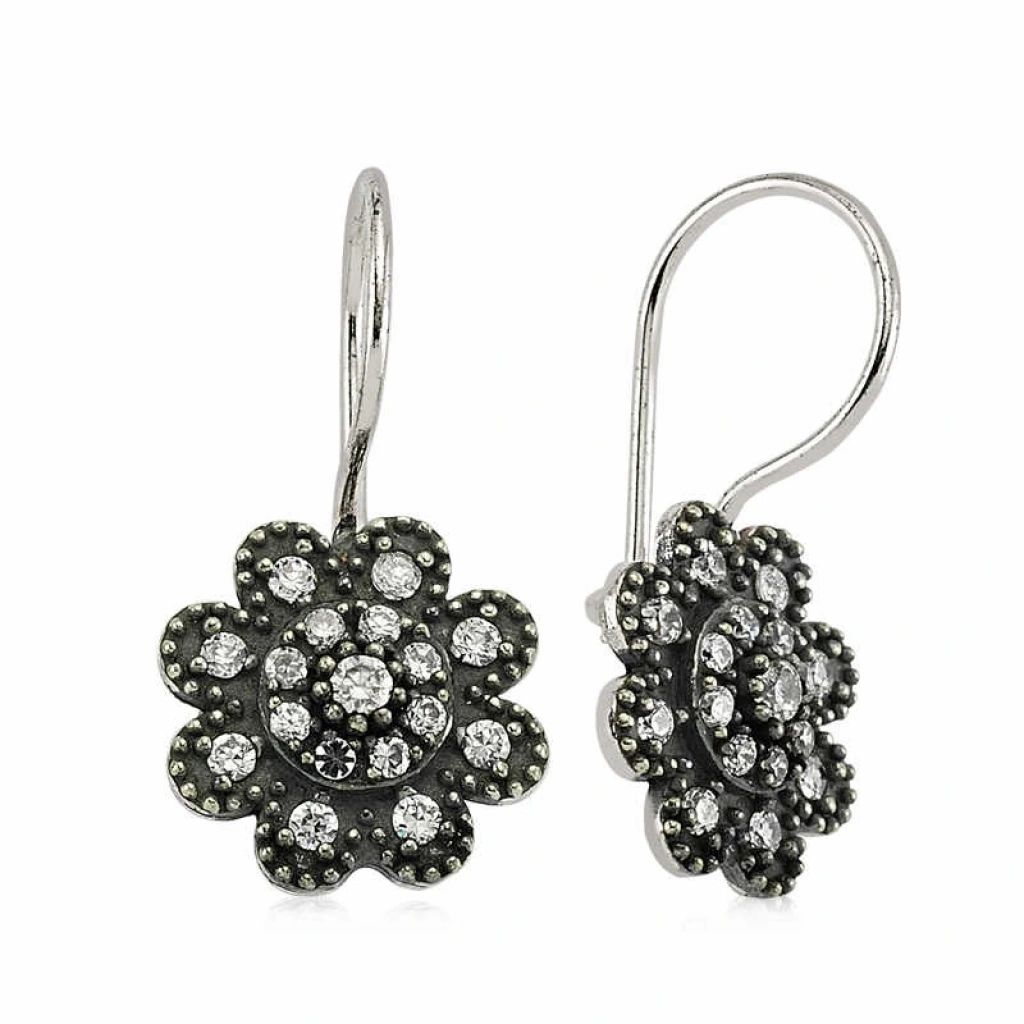 Işıl ışıl zirkon taşlarla süslenmiş bu şık ve modern küpe; göz alıcı çiçeklerle süslendi... Bu farklı tasarımı; doğum günü hediyesi, sevgililer günü hediyesi veya annelere hediye olarak özel günlerde tercih edebileceğiniz çok şık bir seçenektir. Küpe; 925 ayar gümüşten imal edilmiştir. Gümüş üzerine oksit kaplama yapılmıştır. Oksit kaplama yapılan gümüş sallantılı küpeler parlaklığını uzun süre muhafaza eder, kararması gecikir. Tüm gümüş küpe modellerinde olduğu gibi gümüş sallantılı çiçek küpe modeli de el emeği ile üretilmiştir. Üzerinde bulunan taşlar zirkondur. Gümüş ve değerli taşlar nedeniyle belirtilen ortalama ürün ağırlığında ± %10 sapma olabilmektedir.