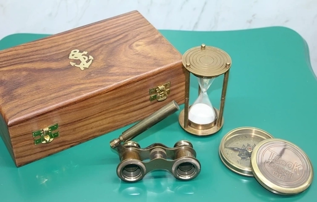 Ahşap Kutulu Pirinç Pusula,Kumsaati,Dürbün Seti 15682 Ürün Ölçüleri 24*8 Cm