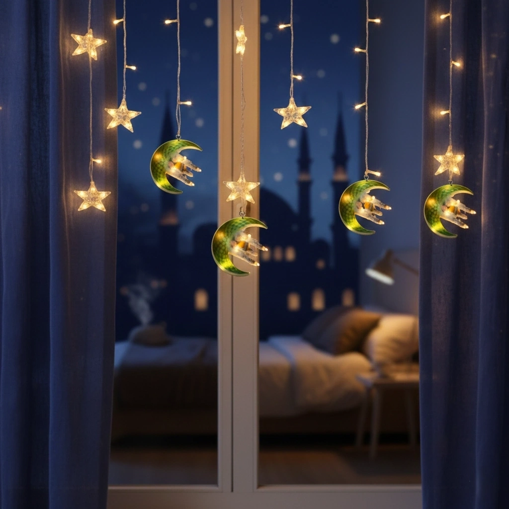 • 3 mt Fişli Yeşil Hilal Cami Yıldız Ramazan Perde LED