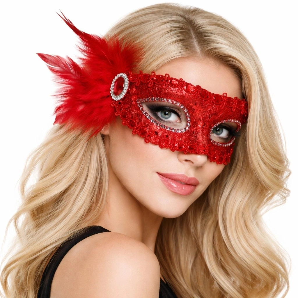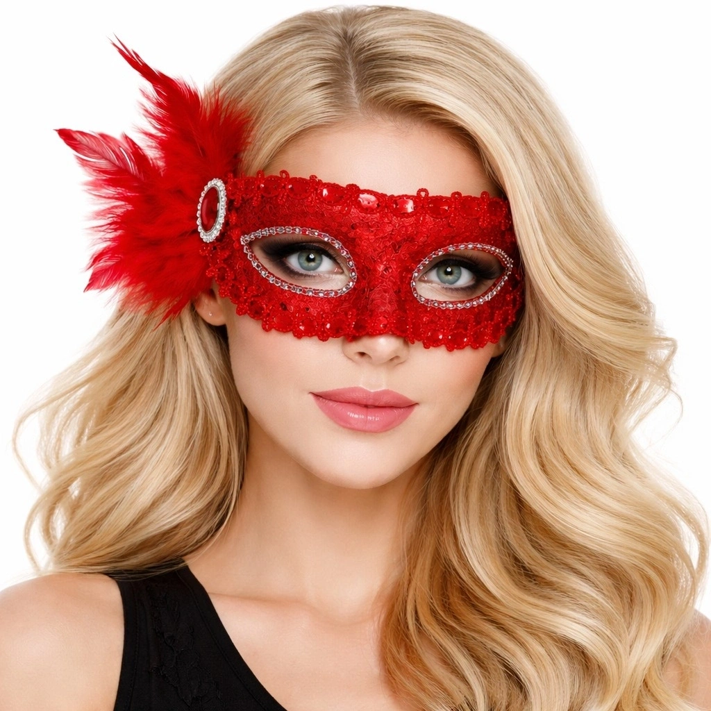 Göz alıcı kırmızı rengi ve parlak payet kaplamasıyla tasarlanan Kırmızı Tüylü Venedik Maskesi, özel gecelerde tüm dikkatleri üzerinize çekmenizi sağlar.