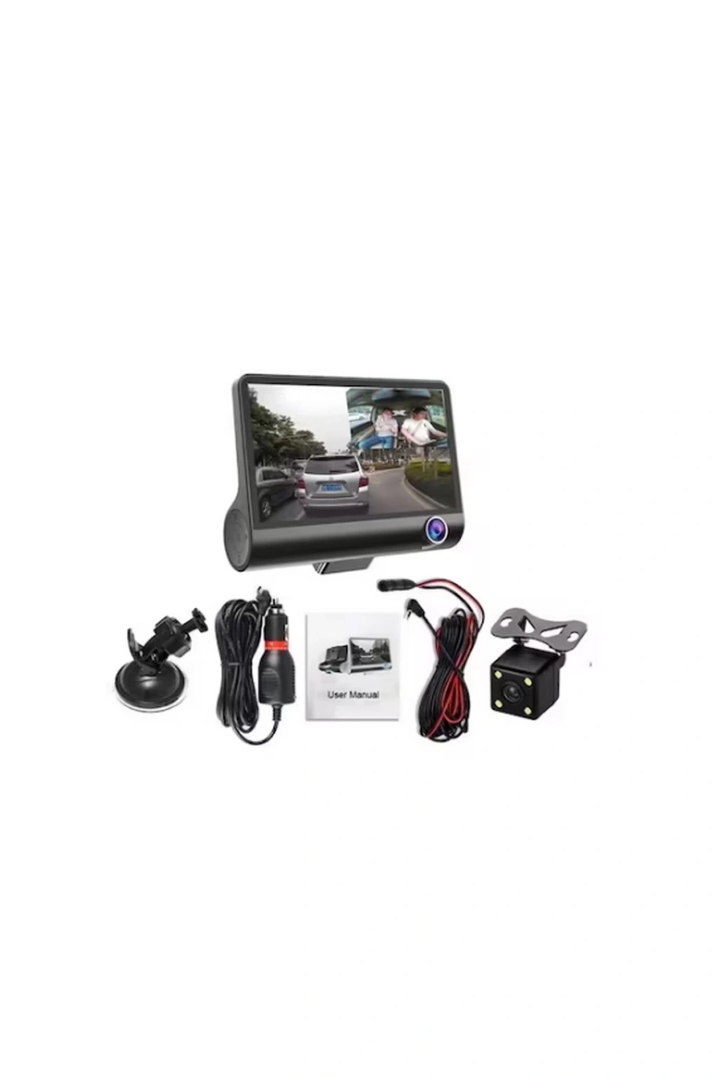 1 araç kamerası / 1 araç şarjı / cam vantus / 1 kullanım kılavuzu / 3 kameralı araç içi kamera çift yönlü oto dvr kayıt / Cihaz üzerinde kamera hem öne hem arkaya dönebilir.