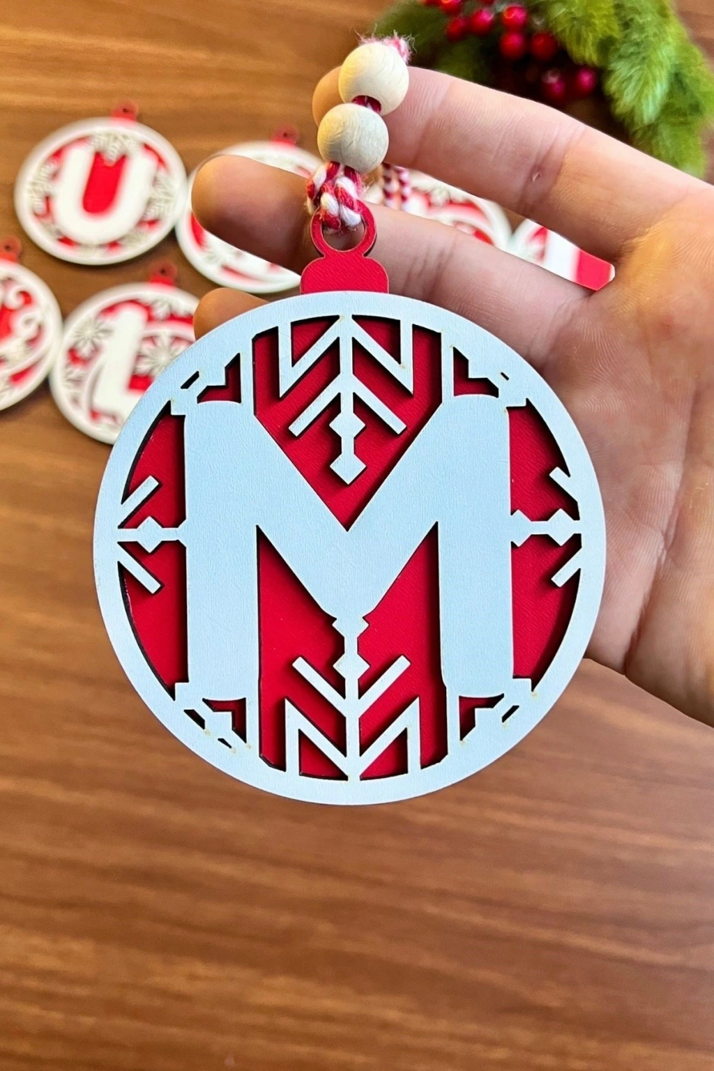 11 Harfli Kırmızı Beyaz İpli MUTLU YILLAR Yazılı Ahşap Yılbaşı Ağaç Süsü