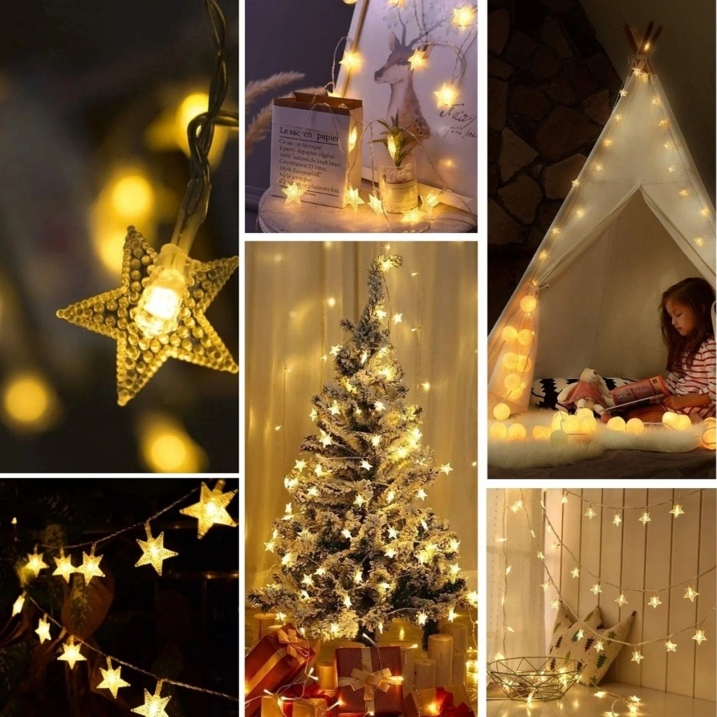 Dekoratif Aydınlatma: Yıldız şekilli 20 LED ampul, 5 metre uzunluğunda kablo üzerinde eşit aralıklarla dizilmiştir.