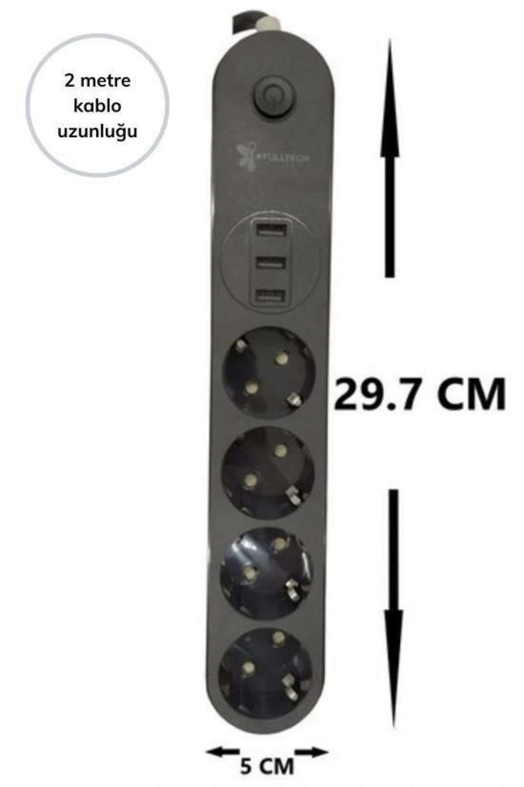 4lü Siyah Anahtarlı 3 Usb Li Akım Korumalı Topraklı Çocuk Korumalı Grup Priz 2 Metre