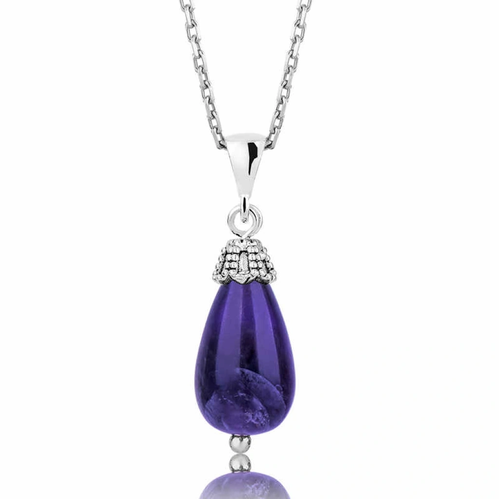 Asırlar boyunca birçok medeniyet tarafından kullanılmış ve günümüze kadar değerini korumuş olan Ametist, hemen her dönem en gözde değerli taşlardan biri olmuştur. Çeşitli kültürlerde “mor yakut”, “mor necef” adlarıyla, kimi zaman da “aşk taşı” olarak tanımlanmıştır. Ametist taşı; tüm değerli taşlar gibi takı, süs ve ziynet eşyalarının yapımında ve oymacılıkta kullanılmaktadır. Takı ve mücevheratta, özellikle şifa ve pozitif enerji verdiğine inanılan koyu mor Ametist öne çıkar. Sadece beden ile temasında değil, taşın bulunduğu ortama yaydığı pozitif enerji de büyük rağbet görmesinde etkilidir. Bu özel taştan imal edilen kolye modelinin metal olan kısımları 925 ayar gümüşten imal edilmiştir. Gümüş üzerine oksit kaplama yapılmıştır. Oksit kaplama yapılan gümüş doğal taşlı kolye modelleri parlaklığını uzun süre muhafaza eder ve oksitlenmesi gecikir. Gümüş olan zincir boyu ortalama 45 cm'dir. Ürünlerimizin tamamında olduğu gibi gümüş ametist taşlı kolye modeli de el emeği ile üretilmiştir. Gümüş ve değerli taşlar nedeniyle ürün ağırlığında ± %10 sapma olabilmektedir.