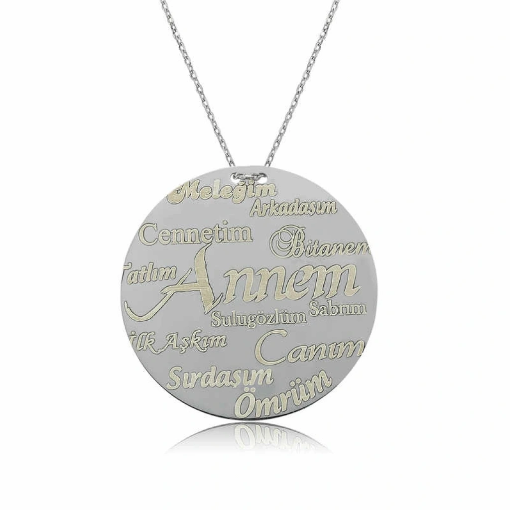 Gümüşün ışıltısı ve kelimelerin anlamı yaşam enerjinizi etrafınıza yansıtacak. Hayatta en değerli varlığımız olan annelerimize onu özel hissettirecek bir hediye vermek isteyenler için gümüş annem yazılı kolye çok uygun olacaktır. Bu annelere özel annem yazılı kolye 925 ayar gümüşten imal edilmiştir. Gümüş üzerine rodyum kaplama yapılmıştır. Rodyum kaplama yapılan gümüş kolye modelleri parlaklığını uzun süre muhafaza eder ve oksitlenmesi gecikir. Zincir uzunluğu ortalama 45 cm'dir. Gümüş annem yazılı kolye diğer tüm gümüş kolye modellerinde olduğu gibi el emeği ile üretilmiştir. Gümüş ve değerli taşlar nedeniyle belirtilen ürün ağırlığında ± %10 sapma olabilmektedir.