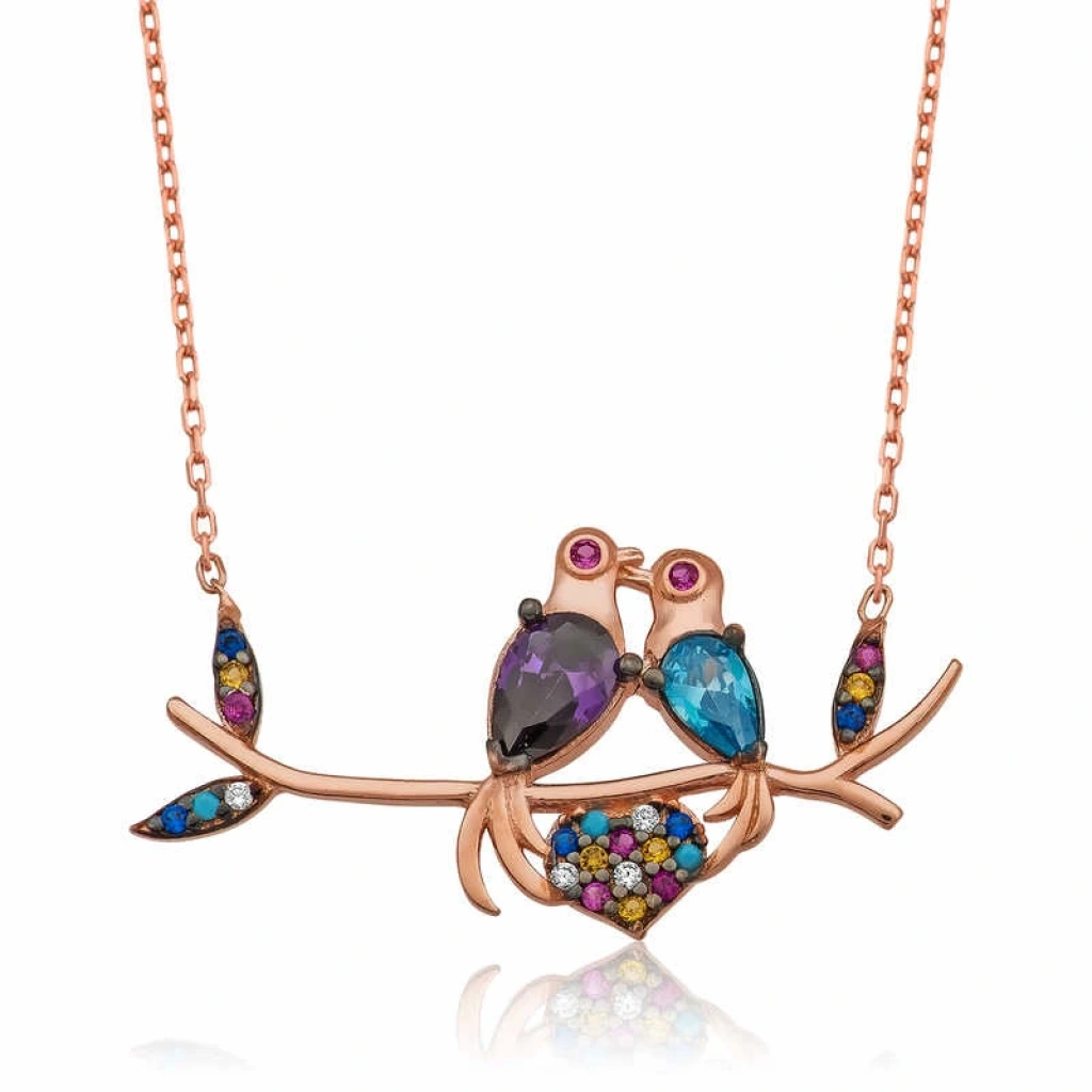 Kadınların boyunlarını ortaya çıkaran ve kıyafetlerini çok daha belirgin hale getiren kolyeler, aksesuarlar arasında vazgeçilmezler arasındadır. Gümüş aşk kuşları kolye yeni yıl, 14 Şubat sevgililer günü ve doğum günü gibi özel günlerde tercih edilebilecek en anlamlı hediye seçeneklerinden biridir. Kaliteli ve şık gümüş kolyeleri satın almak hayal olmaktan çıktı. Ürünlerimizin tamamı el emeği ile üretilmiştir. Gümüş ve değerli taşlar nedeniyle ürün ağırlığında ± %10 sapma olabilmektedir.