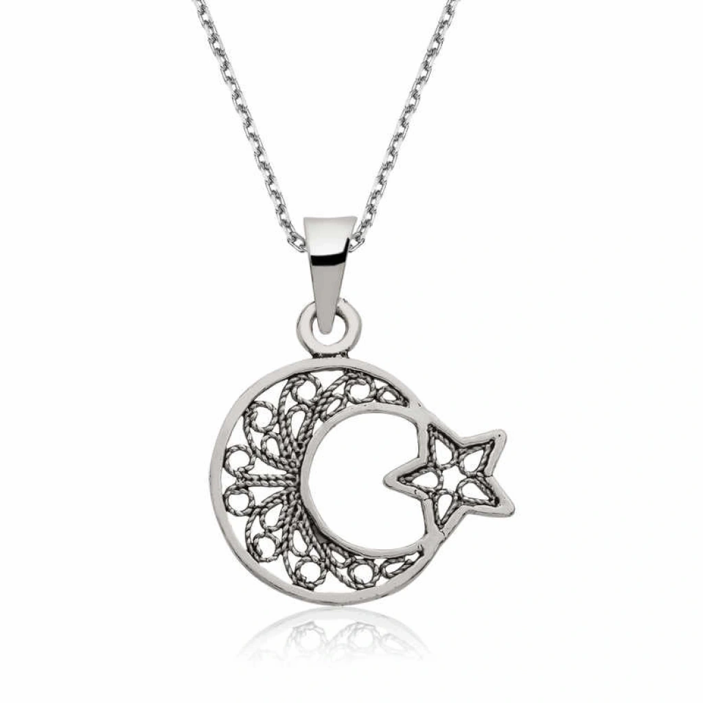 Türk bayrağının ilhamını da kan gölüne yansıyan ay ve yıldızdan aldığını biliyoruz. Bayrağın taşıdığı kutsal anlamı boynunuzda taşımak ve sevdiklerinizle paylaşmak için kaçırılmayacak bir fırsat sunuyoruz. Bu şık kolyeyi anneler günü, sevgililer günü, doğum günü yada özel günlerde sevdiklerinize hediye edebilirsiniz. Bu şık kolye 925 ayar gümüşten imal edilmiştir. Gümüş üzerine rodyum kaplama yapılmıştır. Rodyum kaplama yapılan tüm gümüş kolyeler parlaklığını uzun süre muhafaza eder. Kolyenin 45 cm uzunluğunda gümüş zinciri vardır. Tüm gümüş kolye modellerinde olduğu gibi gümüş ay yıldız kolye de el emeği ile üretilmiştir. Gümüş ve değerli taşlar nedeniyle belirtilen ortalama ürün ağırlığında ± %10 sapma olabilmektedir.