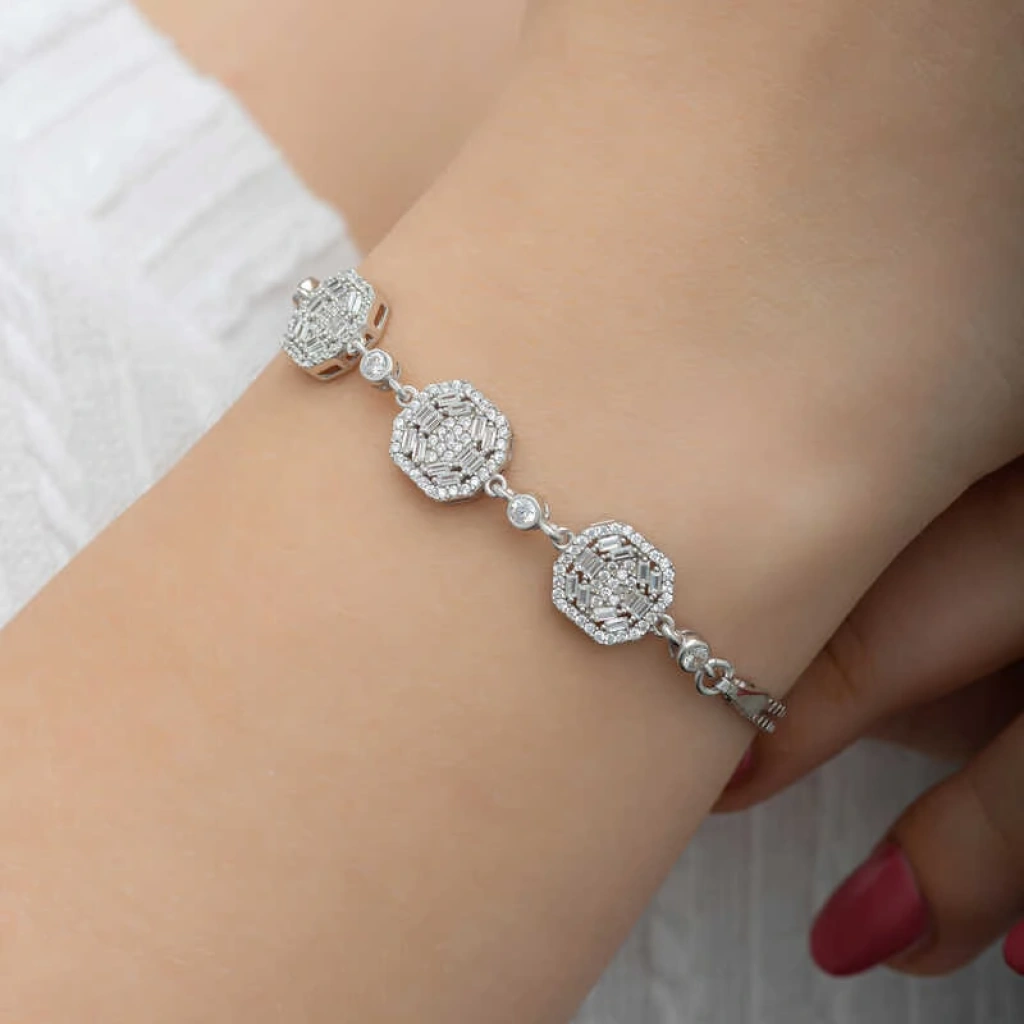 Modaya uyumlu şekilde tasarlanan gümüş baget bileklik modellerini hem gündelik yaşantınızda hem özel gün ve gecelerinizde şık bir şekilde kullanabilirsiniz. Yenilikçi her yaştan kadının beğenisine hitap eden ürünlerle kombinlerinizi tamamlayabilirsiniz. Her biri farklı bir stile hitap edebilen tasarımlarla sizler de spor, klasik ve alternatif giyim tarzlarınıza uygun modellerimizi tercih edebilirsiniz. Bu şık bileklik; doğum günü hediyesi, sevgililer günü hediyesi veya özel günlerde tercih edilebilecek mükemmel bir seçenektir. Gümüş baget taşlı kadın bileklik 925 ayar gümüşten imal edilmiştir. Bu bileklik üzerine rodyum kaplama yapılmıştır. Rodyum kaplama yapılan ürünler parlaklığını uzun süre muhafaza eder, oksitlenmesini geciktirir. Tüm gümüş kadın bileklik modellerinde olduğu gibi gümüş baget taşlı kadın bileklik modeli de el emeği ile üretilmiştir. Gümüş ve değerli taşlar nedeniyle belirtilen ortalama ürün ağırlığında ± %10 sapma olabilmektedir.