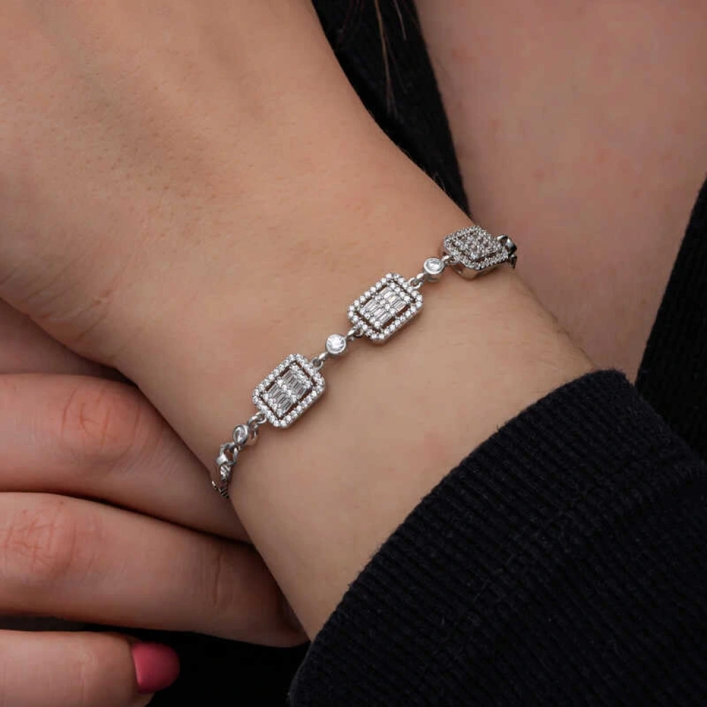 Modaya uyumlu şekilde tasarlanan gümüş baget bileklik modellerini hem gündelik yaşantınızda hem özel gün ve gecelerinizde şık bir şekilde kullanabilirsiniz. Yenilikçi her yaştan kadının beğenisine hitap eden ürünlerle kombinlerinizi tamamlayabilirsiniz. Her biri farklı bir stile hitap edebilen tasarımlarla sizler de spor, klasik ve alternatif giyim tarzlarınıza uygun modellerimizi tercih edebilirsiniz. Bu şık bileklik; doğum günü hediyesi, sevgililer günü hediyesi veya özel günlerde tercih edilebilecek mükemmel bir seçenektir. Gümüş baget taşlı kadın bileklik 925 ayar gümüşten imal edilmiştir. Bu bileklik üzerinde rodyum kaplama vardır. Rodyum kaplama yapılan ürünler parlaklığını uzun süre muhafaza eder, oksitlenmesini geciktirir. Tüm gümüş kadın bileklik modellerinde olduğu gibi gümüş baget taşlı kadın bileklik modeli de el emeği ile üretilmiştir. Gümüş ve değerli taşlar nedeniyle belirtilen ortalama ürün ağırlığında ± %10 sapma olabilmektedir.