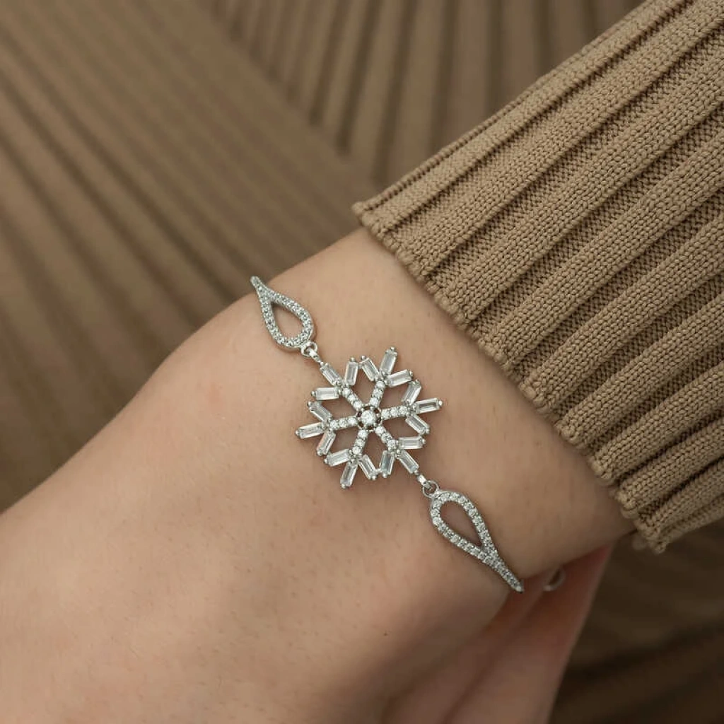 Kadınların ışıltısı, berraklığı kar tanesine benzetilip özel olarak tasarlanmıştır. Kar tanelerinin her birinin bayanlar gibi eşsiz ve ayrı kıymette olması onları özel kılan bir diğer özelliktir. Asilliği her dönemde dikkat çekmeyi başarmıştır. Bunun yanında insanların tıpkı kar taneleri gibi birbirlerine zarar vermeden de mutlu bir şekilde yaşayabileceklerini sembolize etmektedir. Bu şık bileklik; doğum günü hediyesi, sevgililer günü hediyesi veya annelere hediye olarak özel günlerde tercih edilebilecek mükemmel bir seçenektir. Bileklik, 925 ayar gümüşten imal edilmiştir. Gümüş üzerine rodyum kaplama yapılmıştır. Rodyum kaplama yapılan ürünler parlaklığını uzun süre muhafaza eder ve oksitlenmesi gecikir. Tüm gümüş bayan bilekliklerde olduğu gibi bu gümüş baget taşlı kar tanesi bayan bileklik de tamamı el emeği ile üretilmiştir. Gümüş ve değerli taşlar nedeniyle belirtilen ortalama ürün ağırlığında ± %10 sapma olabilmektedir.