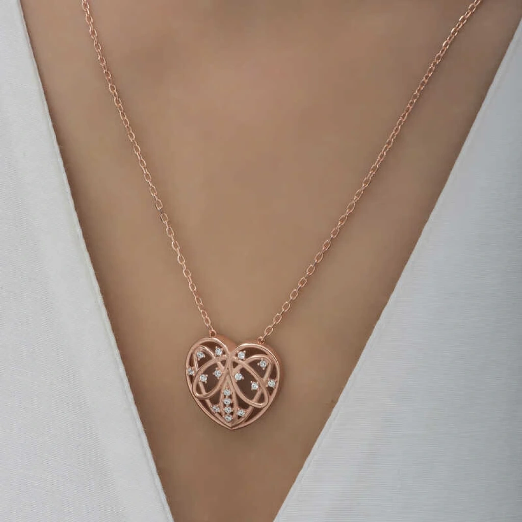 Kalp simgesi daima koşulsuz sevginin ve aşkın sembolü olmuştur. Dini öğretilerde ise kalbin gücü sınırsızdır. Çünkü kalp Yaradanın evi, bizim ise evrene açılan gerçeklik kapımızdır. Bu şık gümüş bombeli kalp kadın kolye; doğum günü hediyesi, sevgililer günü hediyesi veya annelere hediye olarak özel günlerde tercih edilebilecek mükemmel bir seçenektir. Gümüş kalp kadın kolye 925 ayar gümüşten imal edilmiştir. Bu kolye üzerinde rose kaplama yapılmıştır. Rose kaplama yapılan gümüş kadın kolye modelleri parlaklığını uzun süre muhafaza eder. Üzerinde bulunan taşlar zirkondur. Tüm gümüş kadın kolye modellerimizde olduğu gibi gümüş bombeli kalp kadın kolye modeli de el emeği ile üretilmiştir. Gümüş ve değerli taşlar nedeniyle belirtilen ortalama ürün ağırlığında ± %10 sapma olabilmektedir.