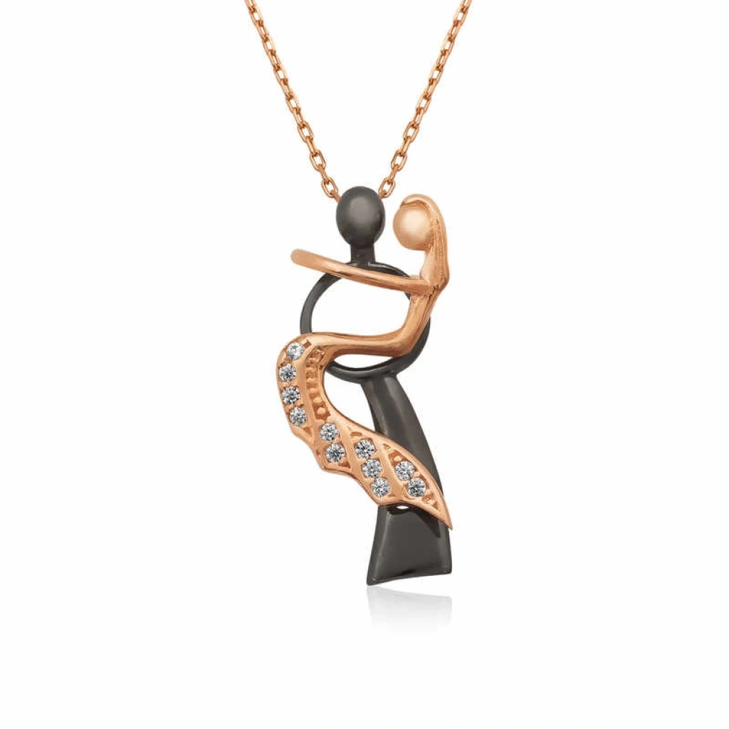 Dans eden iki aşıktan oluşan gümüş kolye günlük hayatta severek kullanabileceğiniz ve sevdiklerinize özel günlerde hediye edebileceğiniz hoş bir aksesuardır. Sevgililer günü, yıl dönümü veya sevgilinizin doğum gününde iyi bir hediye arıyorsanız bu şık kolye tam size göre... Aksesuar olarak son derece şık bir tasarıma sahip olan bu kolye dilerseniz günlük hayatta dilerseniz, davetlerde kullanabileceğiniz her kıyafetinize uyacak oldukça başarılı bir tasarımdır. Sevdiklerine eşsiz bir hediye vermek isteyen kişiler için kaçırılmayacak bir fırsattır. Dans eden çift kolye modeli 925 ayar gümüşten imal edilmiştir. Gümüş üzerine rose altın kaplama yapılmıştır. Rose altın kaplama yapılan gümüş kolye modelleri parlaklığını uzun süre muhafaza eder ve oksitlenmesi gecikir. Kolye üzerinde bulunan taşlar zirkondur. Gümüş kolyenin ortalama boyu 45 cm'dir. Tüm kolye modellerinde olduğu gibi gümüş anahtar kolye modeli de el emeği ile üretilmiştir. Gümüş ve değerli taşlar nedeniyle belirtilen ürün ağırlığında ± %10 sapma olabilmektedir.