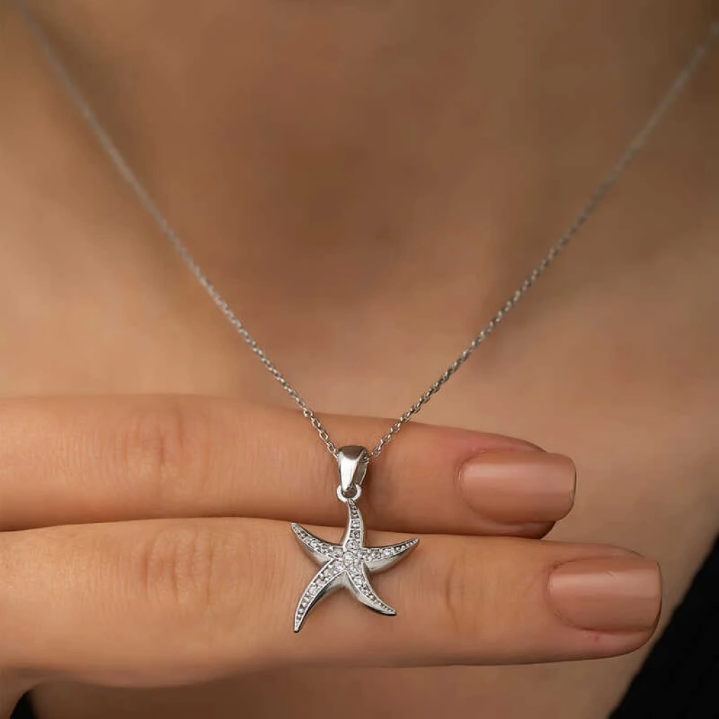 Deniz Yıldızı; ilahi aşkı, ilahi rehberliği, ilhamı, parlaklığı ve umudu sembolize eder. Gökyüzünden denizlere düşmüş deniz yıldızı ile ruhunuz umut ve aşkla dolsun. Gümüş deniz yıldızı kolye ayrıca şıklığı ve zarafeti yansıtıyor. Her dönem sevilen bu sade ve şık kolyeyi; doğum günü hediyesi, sevgililer günü hediyesi veya annelere hediye olarak özel günlerde tercih edebilirsiniz. Deniz yıldızı kolye, 925 ayar gümüşten imal edilmiştir. Gümüş kolye üzerine rodyum kaplama yapılmıştır. Rodyum kaplama yapılan kolyeler parlaklığını uzun süre muhafaza eder, oksitlenmesini geciktirir. Zincir boyu ortalama 45 cm'dir. Tüm gümüş kolye modellerinde olduğu gibi bu gümüş deniz yıldızı kolye de tamamı el emeği ile üretilmiştir. Gümüş ve değerli taşlar nedeniyle belirtilen ortalama ürün ağırlığında ± %10 sapma olabilmektedir.