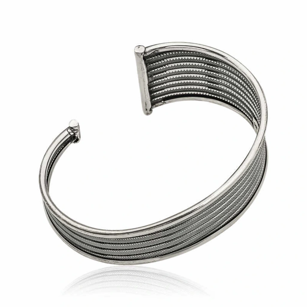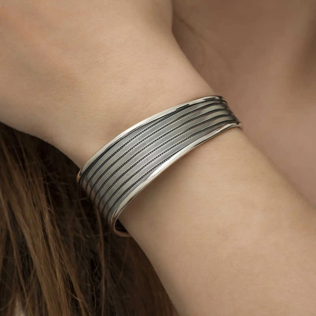 Şık ve fantezi görünümü seven kadınlar için ideal bir seçenektir. Koleksiyonlarda; gösteriş ve şıklığın peşinde olan kadınlar için tamamen el işçiliğiyşe yapılmış bu bilezik her zevke ve konsepte uygun modeli ile sizleri bekliyor. Bu şık modeli; doğum günü hediyesi, sevgililer günü hediyesi olarak özel günlerde tercih edebilirsiniz. Eskitme desenli bayan bilezik modeli 925 ayar gümüşten imal edilmiştir. Gümüş üzerine rodyum kaplama yapılmıştır. Rodyum kaplama yapılan gümüş bayan bilezik modelleri parlaklığını uzun süre muhafaza eder, oksitlenmesi gecikir. Tüm gümüş bayan bilezikler de olduğu gibi bu gümüş eskitme desenli bayan bilezik modeli de el emeği ile üretilmiştir. Gümüş ve değerli taşlar nedeniyle belirtilen ortalama ürün ağırlığında ± %10 sapma olabilmektedir.