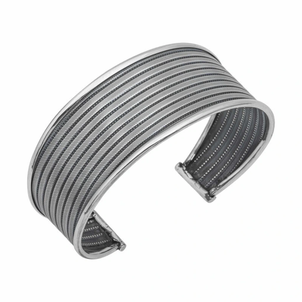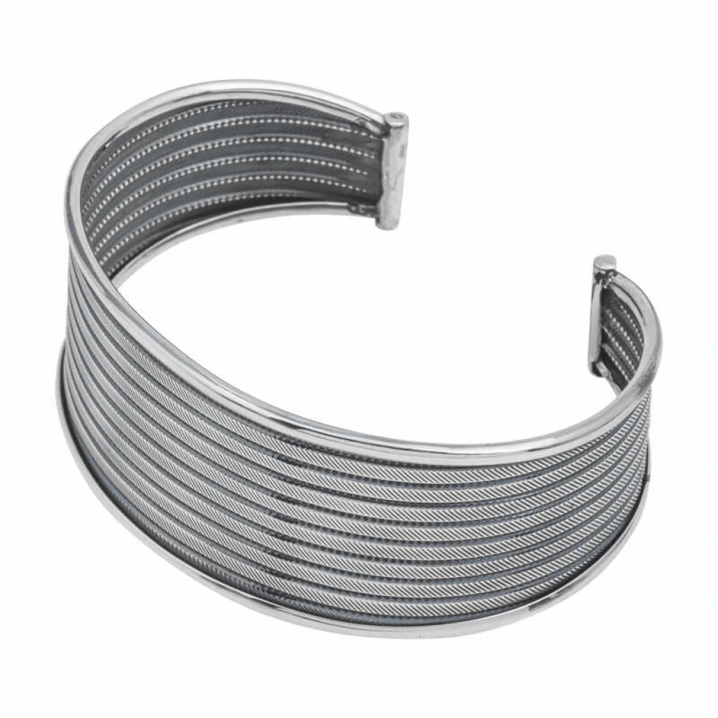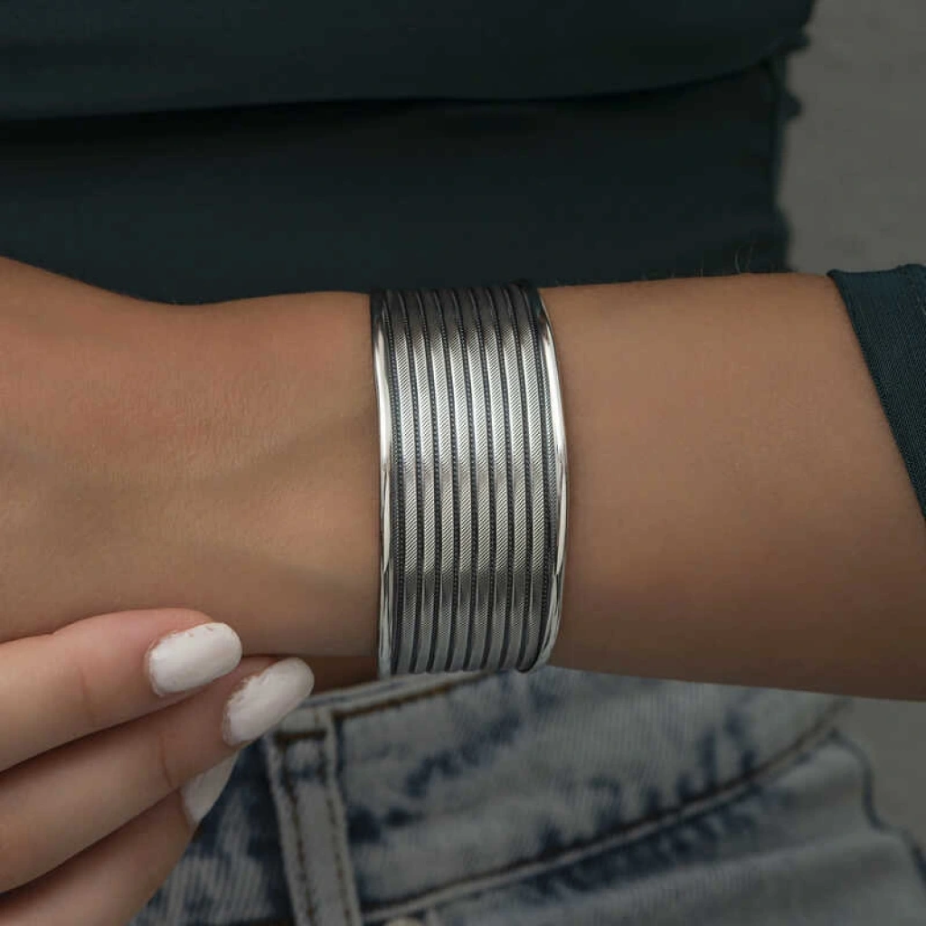 Şık ve fantezi görünümü seven kadınlar için ideal bir seçenektir. Koleksiyonlarda; gösteriş ve şıklığın peşinde olan kadınlar için tamamen el işçiliğiyşe yapılmış bu bilezik her zevke ve konsepte uygun modeli ile sizleri bekliyor. Bu şık modeli; doğum günü hediyesi, sevgililer günü hediyesi olarak özel günlerde tercih edebilirsiniz. Eskitme desenli kadın bilezik modeli 925 ayar gümüşten imal edilmiştir. Gümüş üzerine rodyum kaplama yapılmıştır. Rodyum kaplama yapılan gümüş kadın bilezik modelleri parlaklığını uzun süre muhafaza eder, oksitlenmesi gecikir. Tüm gümüş kadın bilezikler de olduğu gibi bu gümüş eskitme desenli kadın bilezik modeli de el emeği ile üretilmiştir. Gümüş ve değerli taşlar nedeniyle belirtilen ortalama ürün ağırlığında ± %10 sapma olabilmektedir.