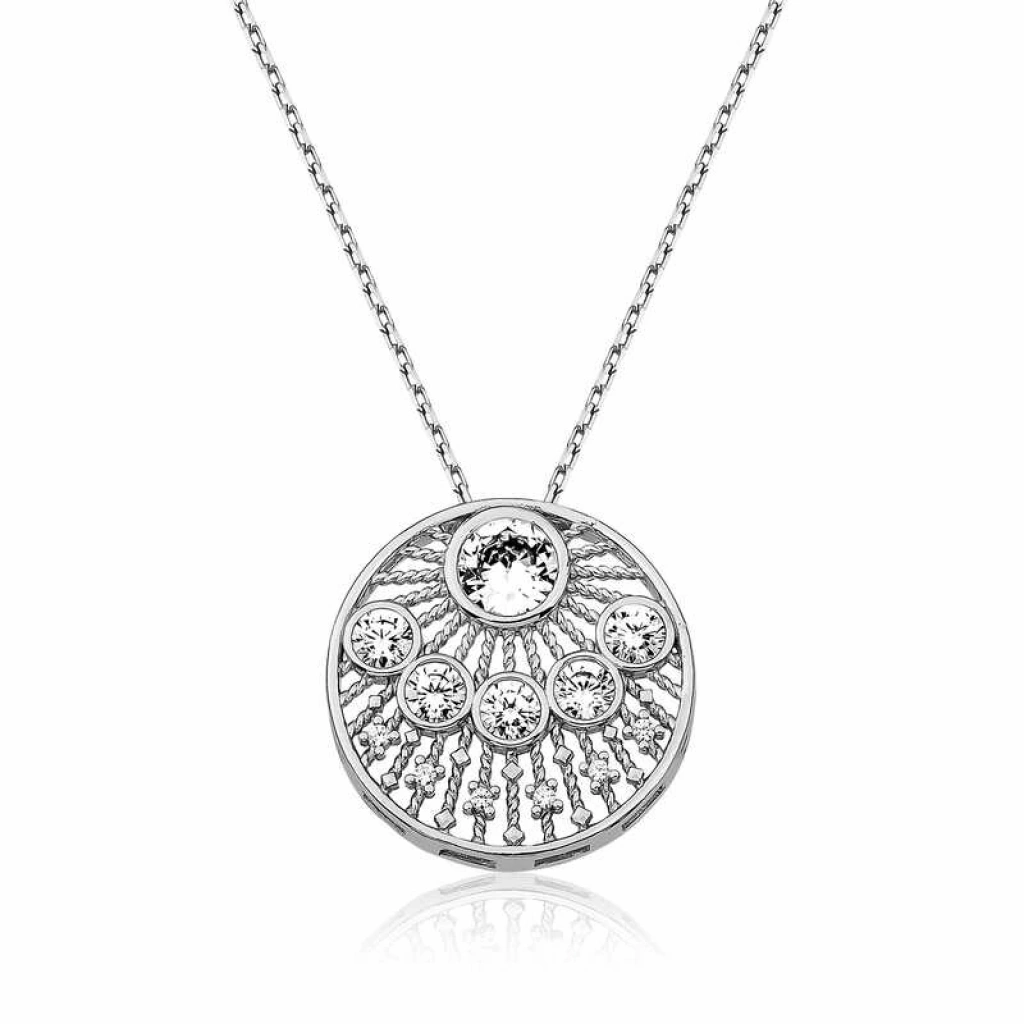 Beyaz zirkon taşlarla süslenmiş etnik desenli kolye, şık ve ışıltıyı sevenler için tasarlandı. Günün her anında severek kullanabileceğiniz, herkesin beğenisini toplayabilecek ve göz kamaştırabilecek bir üründür. Gümüş etnik desenli kolye 925 ayar gümüşten imal edilmiştir. Bu kolye üzerine rodyum kaplama yapılmıştır. Rodyum kaplama yapılan ürünler parlaklığını uzun süre muhafaza eder. Üzerinde bulunan taşlar zirkon'dur. Tüm gümüş kolye modellerinde olduğu gibi gümüş etnik desenli kolye modeli de el emeği ile üretilmiştir. Gümüş ve değerli taşlar nedeniyle belirtilen ortalama ürün ağırlığında ± %10 sapma olabilmektedir. Ürünlerimizin tamamı el emeği ile üretilmiştir.