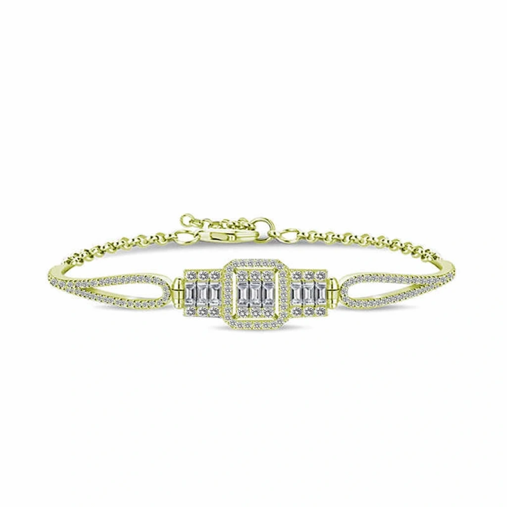 Kadınların kombinlerini tamamlayabilecekleri en önemli mücevherlerden olan bileklik modelleri baget taşlı özgün tasarıma sahip gümüş bileklikle yeniden şekilleniyor. Tarzınızı dışarıya en ışıltılı şekilde vurgulayabileceğiniz gümüş baget bileklik şık ve göz kamaştırıcı olabilmenizi sağlıyor. Gündelik hayatınızın her anında kullanabileceğiniz gümüş baget bileklik modeline sizler de sahip olabilirsiniz. Klasikleşmiş baget bileklik modellerine iyi bir alternatif olarak ön plana çıkan bu model her yaştan kadının beğenisini toplamayı başarıyor. Tek başına kullanabileceğiniz veya farklı aksesuarlarınız ile birlikte kombinleyebileceğiniz gümüş baget bileklik modeliyle kıyafetlerinize ve tarzınıza farklı bir hava kazandırabilirsiniz. Işıl ışıl baget ve zirkon taşlarla süslenmiş bu şık bileklik modeli; doğum günü hediyesi, sevgililer günü hediyesi veya annelere hediye olarak özel günlerde tercih edebileceğiniz çok şık bir seçenektir. Bu bileklik 925 ayar gümüşten imal edilmiştir. Gümüş üzerine altın kaplama yapılmıştır. Altın kaplama yapılan gümüş bileklikler parlaklığını uzun süre muhafaza eder ve gümüşü sarı renge dönüştürür. Tüm bayan gümüş bilekliklerde olduğu gibi gümüş gold baget bayan bileklik modeli de el emeği ile üretilmiştir. Gümüş ve değerli taşlar nedeniyle belirtilen ortalama ürün ağırlığında ± %10 sapma olabilmektedir.