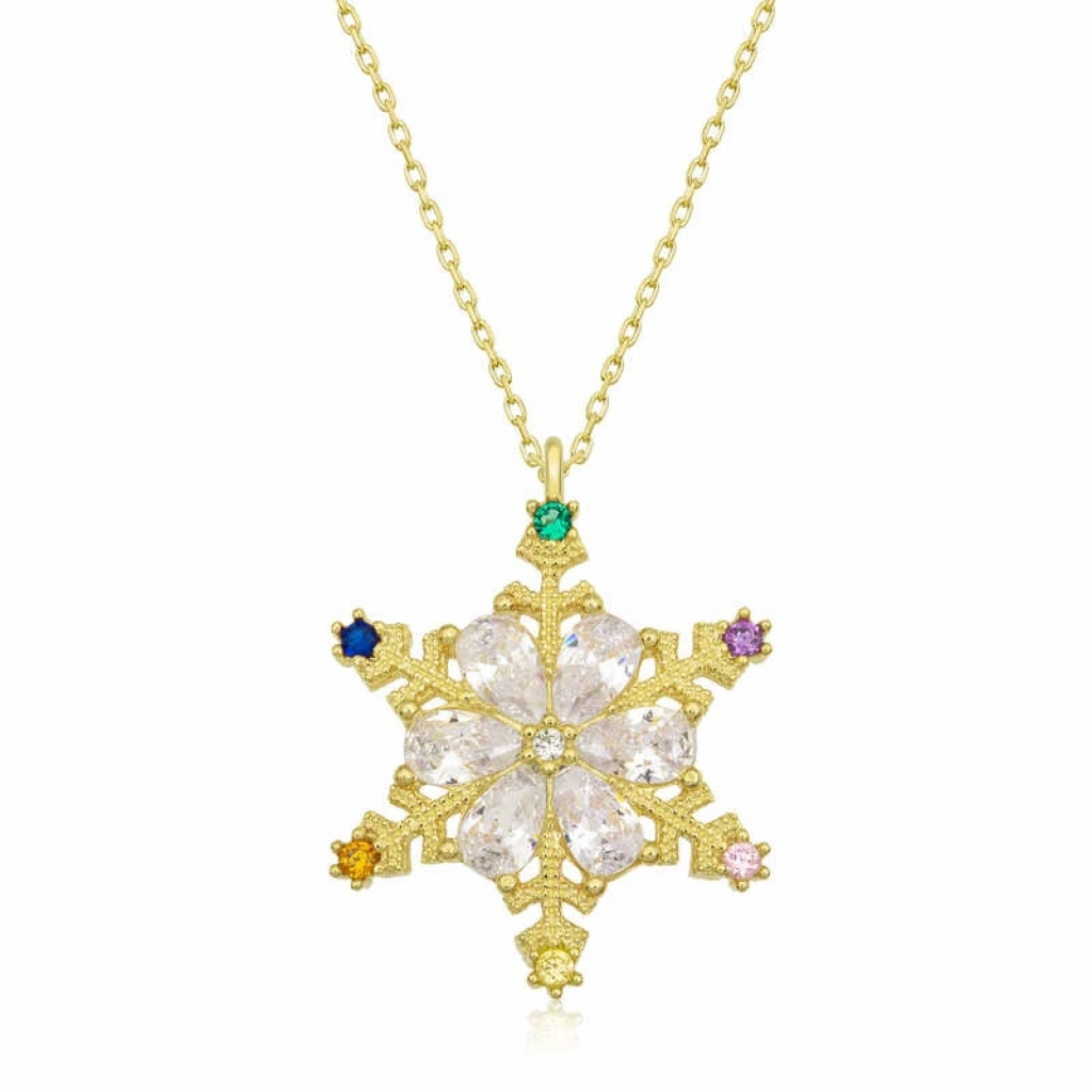 Her kar tanesinden aslında sadece bir tane var. Sevdiğiniz kişiye hediye ettiğiniz kar tanesi kolye ile onun sizin için eşsiz ve biricik olduğunu sessizce dillendirmiş oluyorsunuz. Sizlerde her zevke uygun gümüş kar tanesi kadın kolye modeli ile şıklığınıza ışıltı katın. Kar tanesi kadın kolye 925 ayar gümüşten imal edilmiştir. Gümüş üzerine gold kaplama yapılmıştır. Gold kaplama yapılan gümüş kadın kolye modelleri parlaklığını uzun süre muhafaza eder ve oksitlenmesi gecikir. Kolye üzerinde bulunan beyaz ve renkli taşlar zirkondur. Gümüş olan zincir boyu ortalama 45 cm'dir. Gümüş kar tanesi kadın kolye modeli diğer kar tanesi kadın kolye modelleri gibi el emeği ile üretilmiştir. Gümüş ve değerli taşlar belirtilen nedeniyle ürün ağırlığında ± %10 sapma olabilmektedir.