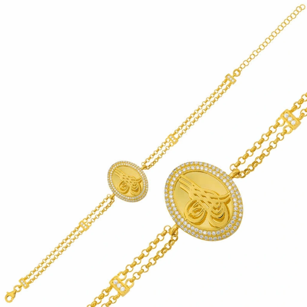 Osmanlı devleti padişahlarının imzası olan tuğra modeli bu özel tasarım bayan bileklik modeline işlenmiştir. 925 ayar gümüşten imal edilmiştir. Bileklik üzerindeki beyaz taşlar zirkondur. Gümüş üzerine altın kaplama yapılmıştır. Altın kaplama yapılan gümüş bileklik modelleri parlaklığını uzun süre muhafaza eder. Uzatma zinciri sayesinde her bilek kalınlıklarına göre ayarlanabilir. Tüm bayan bileklik modellerimizde olduğu gibi tuğralı bayan bileklik modeli de tamamen el emeği ile üretilmiştir. Gümüş ve değerli taşlar nedeniyle belirtilen ortalama ürün ağırlığında ± %10 sapma olabilmektedir.