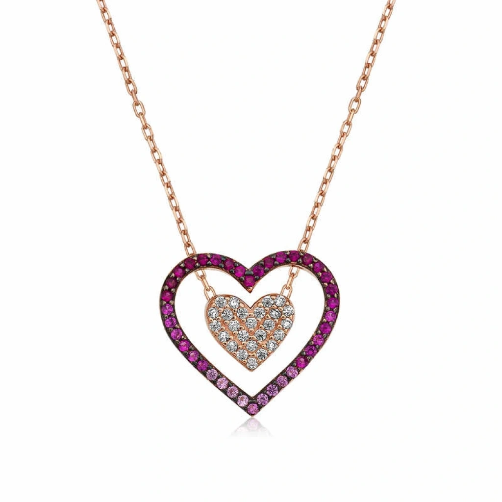 Kalp simgesi daima koşulsuz sevginin ve aşkın sembolü olmuştur. Dini öğretilerde ise kalbin gücü sınırsızdır. Çünkü kalp Yaradanın evi, bizim ise evrene açılan gerçeklik kapımızdır. İki kalp kolye sizi ve sevgilinizi temsil edecek. Bu şık iki kalp kolye; doğum günü hediyesi, sevgililer günü hediyesi veya annelere hediye olarak özel günlerde tercih edilebilecek mükemmel bir seçenektir. Gümüş iki kalp bayan kolye 925 ayar gümüşten imal edilmiştir. Bu kolye üzerinde rose kaplama yapılmıştır. Rose kaplama yapılan gümüş kolye modelleri parlaklığını uzun süre muhafaza eder, gümüş rengini pembe renge çevirir. Üzerinde bulunan ışıl ışıl taşlar zirkondur. Tüm gümüş kolye modellerimizde olduğu gibi gümüş iki kalp kolye modeli de el emeği ile üretilmiştir. Gümüş ve değerli taşlar nedeniyle belirtilen ortalama ürün ağırlığında ± %10 sapma olabilmektedir.