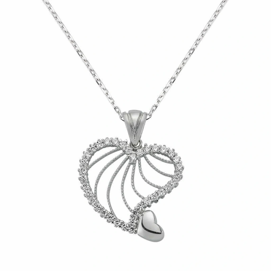 Kalp deseniyle aşkı ifade eden gümüş kalpli  kolye modeli ile sevginiz, sevdiğiniz kadının teninde hayat bulsun. Genç sevgililerin ve kendini genç hissedenlerin özel günlerde seçebileceği bu kalpli  kolye modeli ile sevdiğinizin boynunu aşkla süsleyin. Sizin olduğu kadar sevdiklerinizin de keyifle takacağı kalp desenli kolye modeli sevdiğinize en güzel hediyelerden biri olacaktır. Kalpli  kolye modeli 925 ayar gümüşten imal edilmiştir. Gümüş üzerine rodyum kaplama yapılmıştır. Rodyum kaplama yapılan gümüş  kalpli kolye modelleri parlaklığını uzun süre muhafaza eder ve oksitlenmesi gecikir. Kolye üzerinde bulunan beyaz taşlar zirkondur. Gümüş olan zincir boyu ortalama 45 cm'dir. Tüm  kolye modellerinde olduğu gibi gümüş kalpli  kolye modeli de el emeği ile üretilmiştir. Gümüş ve değerli taşlar nedeniyle belirtilen ortalama ürün ağırlığında ± %10 sapma olabilmektedir.