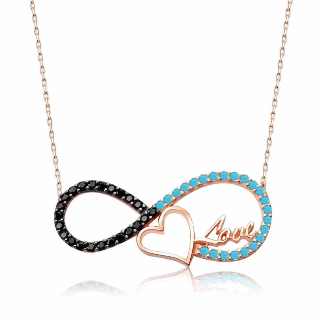 Sevgilinize sonsuz aşkı ifade etmenin en güzel ve en anlamlı yollarından biri sonsuzluk temalı takılardır. Sevgilinize hediye edeceğiniz bu özel kolye ile ona olan sonsuz aşkınızı sevginizi ifade edebilir sonsuza kadar birlikte olacağınız mesajı verebilirsiniz. Firuze taşlı sonsuzluk kolye 925 ayar gümüşten imal edilmiştir. Gümüş üzerine altın kaplama yapılmıştır. Altın kaplama yapılan gümüş kolye modelleri parlaklığını uzun süre muhafaza eder ve oksitlenmesi gecikir. Kolye üzerinde bulunan taşlar firuze renkli nano taşlardır. Gümüş olan zincir boyu ortalama 45 cm'dir. Bu firuze taşlı sonsuzluk kolye diğer tüm gümüş kolye modellerinde olduğu gibi el emeği ile üretilmiştir. Gümüş ve değerli taşlar nedeniyle belirtilen ürün ağırlığında ± %10 sapma olabilmektedir.
