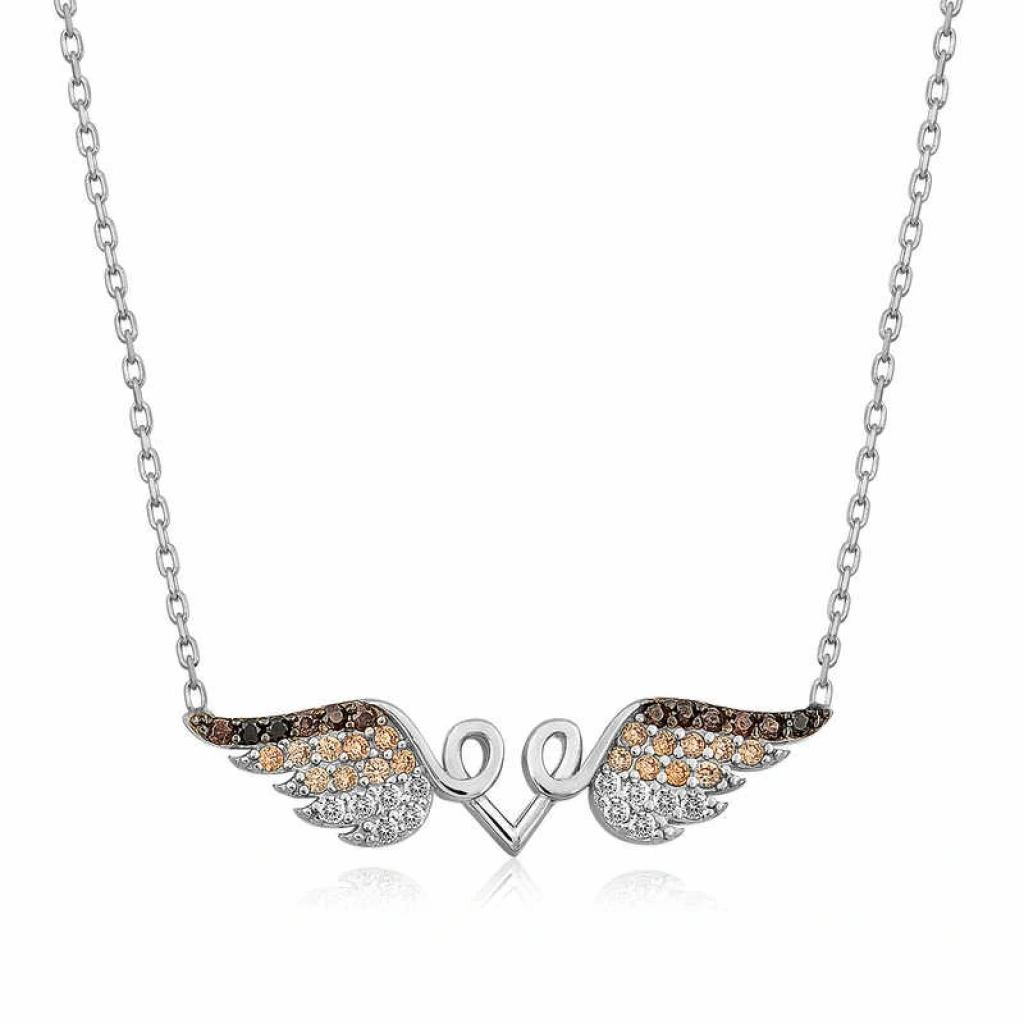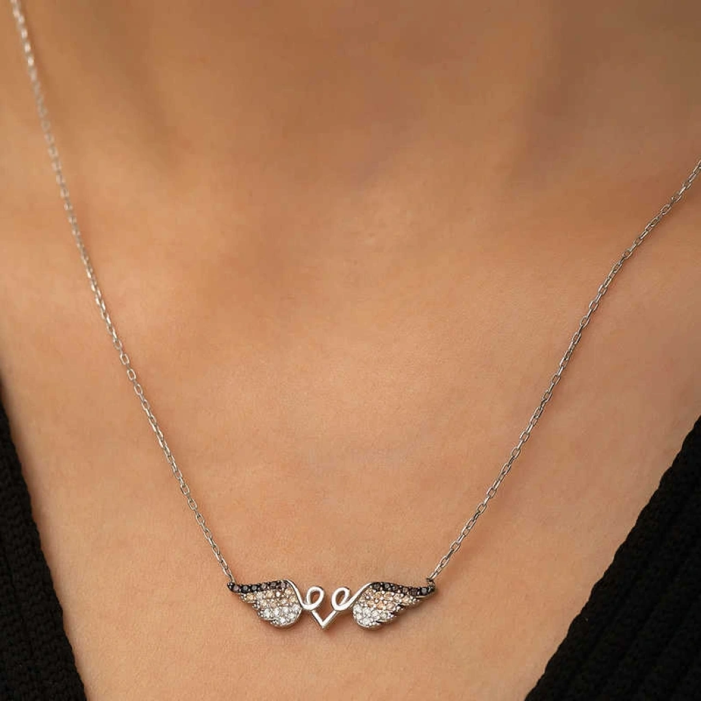 Melekler saflığın ve temizliğin simgeleridir. Bu nedenle melek kanatlı kalp kolye hediye edilen kişiye melek kadar saf ve temiz bir kalbinin olduğu mesajı verilmek istenmektedir. Bu özel melek kanatlı kalp kolye 925 ayar gümüşten imal edilmiştir. Gümüş üzerine rodyum kaplama yapılmıştır. Rodyum kaplama yapılan gümüş kolyeler parlaklığını uzun süre muhafaza eder ve oksitlenmesi gecikir. Tüm gümüş kolyelerde olduğu gibi gümüş melek kanatlı kalp kolye de el emeği ile üretilmiştir. Gümüş ve değerli taşlar nedeniyle belirtilen ürün ağırlığında ± %10 sapma olabilmektedir.