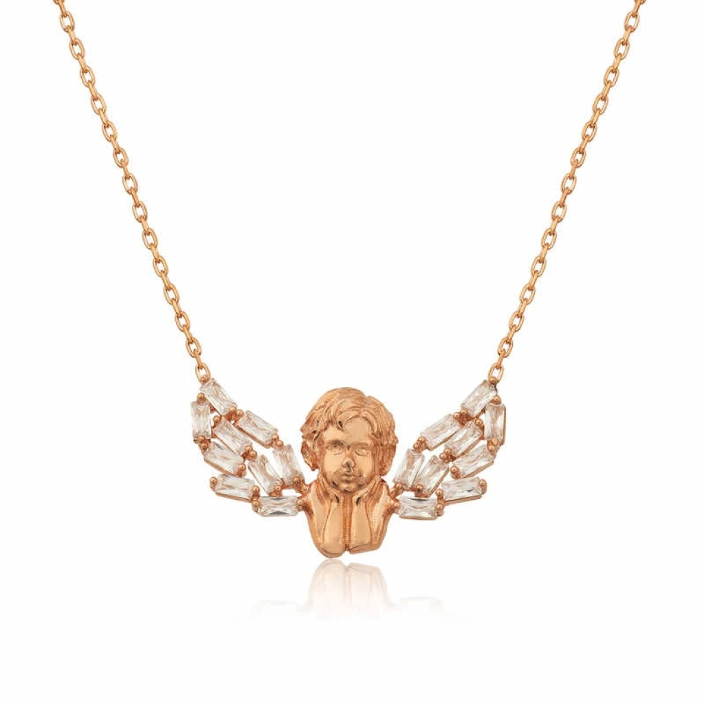 Kanatlı melek motifi ile tasarlanmış bu kolye modeli 925 ayar gümüşten imal edilmiştir. Gümüş üzerinde bulunan taşlar zirkondur. Gümüş kanatlı melek kolye üzerine rose altın kaplama yapılmıştır. Rose altın kaplama yapılan tüm gümüş kolye modelleri parlaklığını uzun süre muhafaza eder ve gümüşü pembe renge dönüştürür.Zincir uzunluğu 45 cm'dir. Tüm gümüş kolye modellerinde olduğu gibi gümüş kanatlı melek kolye modelimiz de el emeği ile üretilmiştir. Gümüş ve değerli taşlar nedeniyle belirtilen ortalama ürün ağırlığında ± %10 sapma olabilmektedir.