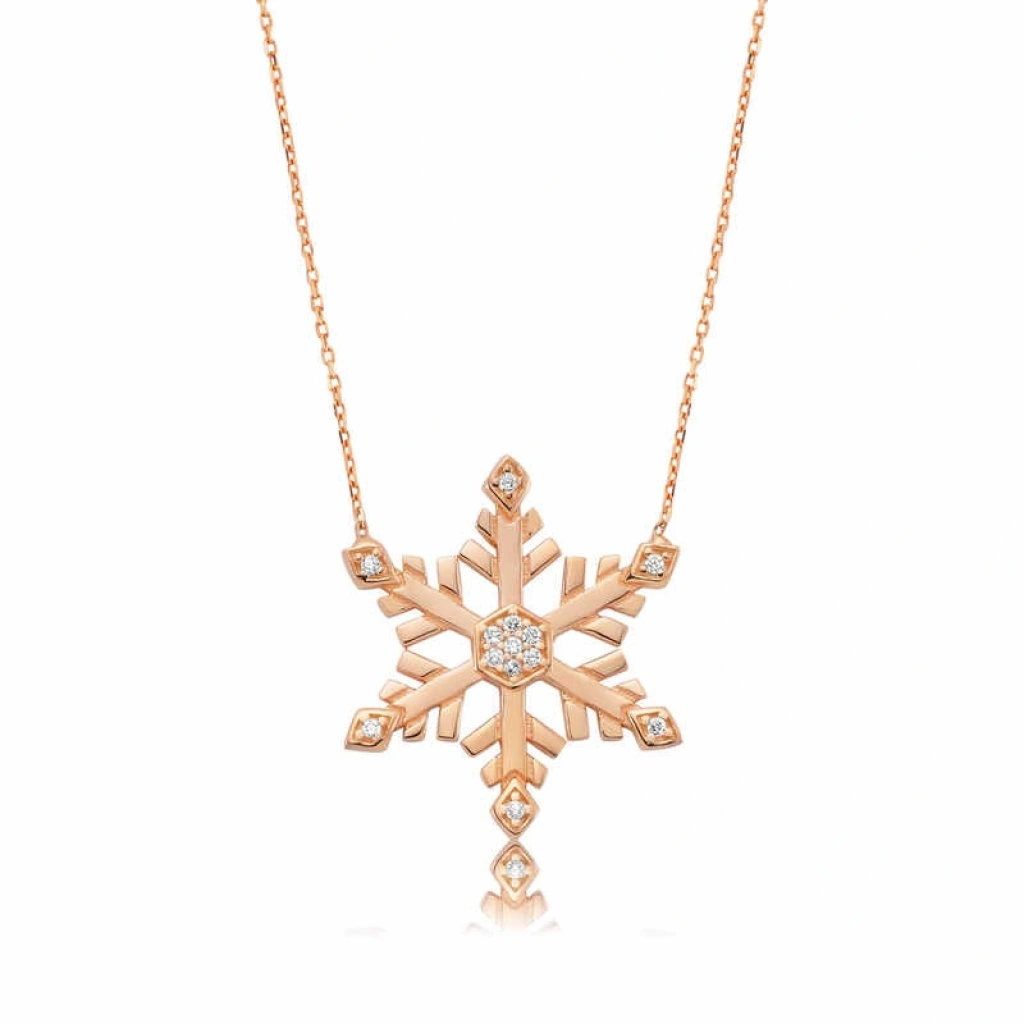 Bu harika tasarıma sahip kar tanesi kolye 925 ayar gümüşten imal edilmiştir. Birçok kar kristal çeşidi olmasına rağmen, kar tanelerinin kristal yapıları birbirinin tıpa tıp aynısı değildir, her bir kar tanesi eşsizdir ve bir benzeri yoktur. Sevdiklerine eşsiz bir hediye vermek isteyen kişiler için, zirkon taşlarla süslenmiş bu kar tanesi kolye mükemmel anlamlar yüklü kaçırılmayacak bir hediye fırsatıdır. Bu kar tanesi kolye tasarımının üzerine rose altın kaplama yapılmıştır. Rose altın kaplama yapılan gümüş kolye modelleri parlaklığını uzun süre muhafaza eder, oksitlenmesi gecikir. Gümüş kolyenin üzerinde bulunan taşlar zirkondur. Ortalaması 45 cm olan gümüş bir zincir ile gönderilir. Tüm gümüş kolye tasarımları ve modelleri el emeği ile üretilmiştir. Gümüş ve değerli taşlar nedeniyle belirtilen ürün ağırlığında ± %10 sapma olabilmektedir.