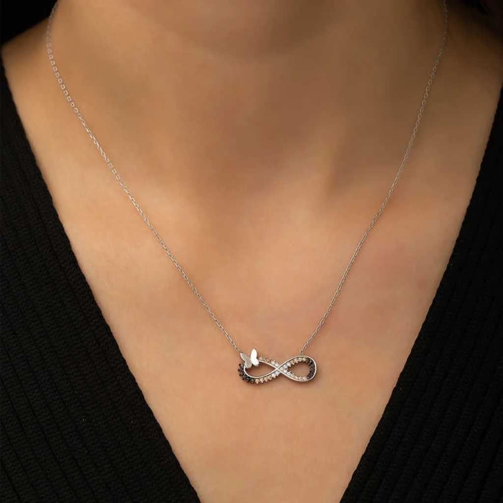 Sonsuza kadar sürecek aşkı anlatmanın en güzel yollarından biri de sevgiliye sonsuzluk sembollü gümüş takılar hediye etmektir. Sonsuzluk sembolü ebedi aşkın ve sadakatin işareti olarak evlilik yıl dönümü veya sevgililer günü gibi özel günlerde alınabilecek anlamlı hediyelerinden biri olabilecektir. Kelebekli sonsuzluk kolye 925 ayar gümüşten imal edilmiştir. Gümüş üzerine rose altın kaplama yapılmıştır. Rose altın kaplama yapılan gümüş kolye modelleri parlaklığını uzun süre muhafaza eder ve oksitlenmesi gecikir. Kolye üzerinde bulunan taşlar zirkondur. Gümüş kelebekli sonsuzluk kolye tamamı el emeği ile üretilmiştir. Tüm gümüş kolye modellerinde olduğu gibi gümüş kelebekli sonsuzluk kolye de el emeği ile üretilmiştir. Gümüş ve değerli taşlar nedeniyle belirtilen ürün ağırlığında ± %10 sapma olabilmektedir.