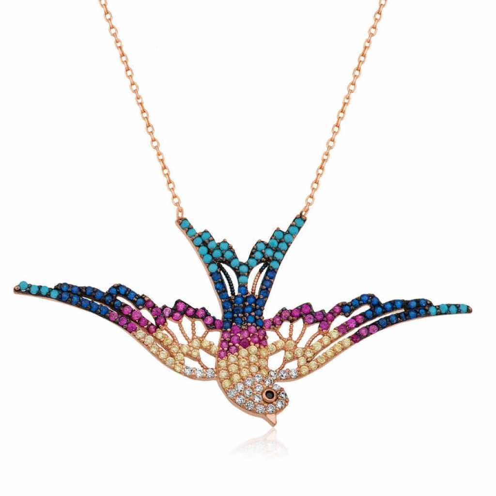 Güzelliğiyle, yıllar boyu gerek şairlerin gerekse âşıkların diline pelesenk olan kuşlardan biri olan kırlangıç, üzerinde taşıdığı anlamlarıyla da âşıkların övgüsünü hak etmektedir. Kırlangıç kuşunun özellikle aşıklar tarafından tercih edilmesinin sebebi ise tek eşli bir kuş olmasıdır. Aynı zamanda sadakati ve ailesel öğeleri de barındıran kırlangıç figürü; özgürlüğün simgesi olarak da nitelendirilebilmektedir. Sizler de sevdiklerinize aşkın sembolü olan kırlangıç kolye modelini armağan edebilir, bu sayede onları mutlu edebilirsiniz. Renkli taşlı kolye 925 ayar gümüşten imal edilmiştir. Kolye üzerine rose altın kaplama yapılmıştır. Rose altın kaplama yapılan gümüş kolyeler parlaklığını uzun süre muhafaza eder, oksitlenmesi gecikir. Gümüş olan zincir boyu ortalama 45 cm'dir. Üzerinde bulunan taşlar zirkondur. Tüm gümüş kolye modellerinde olduğu gibi gümüş kırlangıç kolye modeli de el emeği ile üretilmiştir. Gümüş ve değerli taşlar nedeniyle belirtilen ortalama ürün ağırlığında ± %10 sapma olabilmektedir.