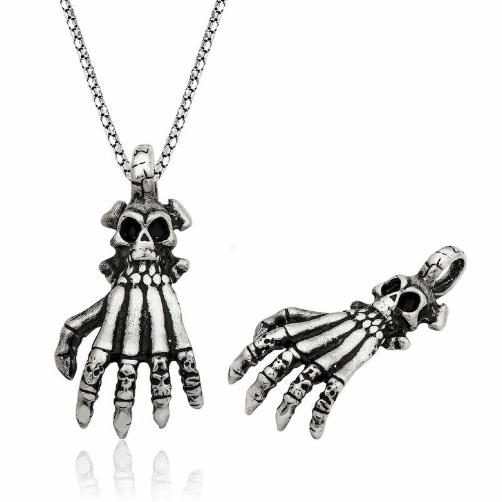 Kuru kafanın gizem ve ölüm anlamı vardır. Kuru kafa el erkek kolye 925 ayar gümüşten imal edilmiştir. Kolye üzerine oksit kaplama yapılmıştır. Diğer gümüş kolyelerde olduğu gibi gümüş kuru kafa el erkek kolye de tamamı el emeği ile üretilmiştir. Gümüş ve değerli taşlar nedeniyle belirtilen ortalama ürün ağırlığında ± %10 sapma olabilmektedir.