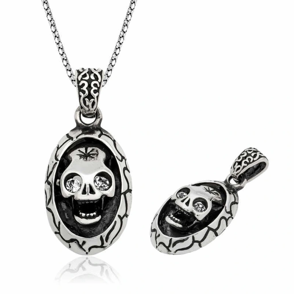 Kuru kafanın gizem ve ölüm anlamı vardır. Kuru kafa el erkek kolye 925 ayar gümüşten imal edilmiştir. Kolye üzerine oksit kaplama yapılmıştır. Diğer gümüş kolyelerde olduğu gibi gümüş kuru kafa el erkek kolye de tamamı el emeği ile üretilmiştir. Gümüş ve değerli taşlar nedeniyle belirtilen ortalama ürün ağırlığında ± %10 sapma olabilmektedir.