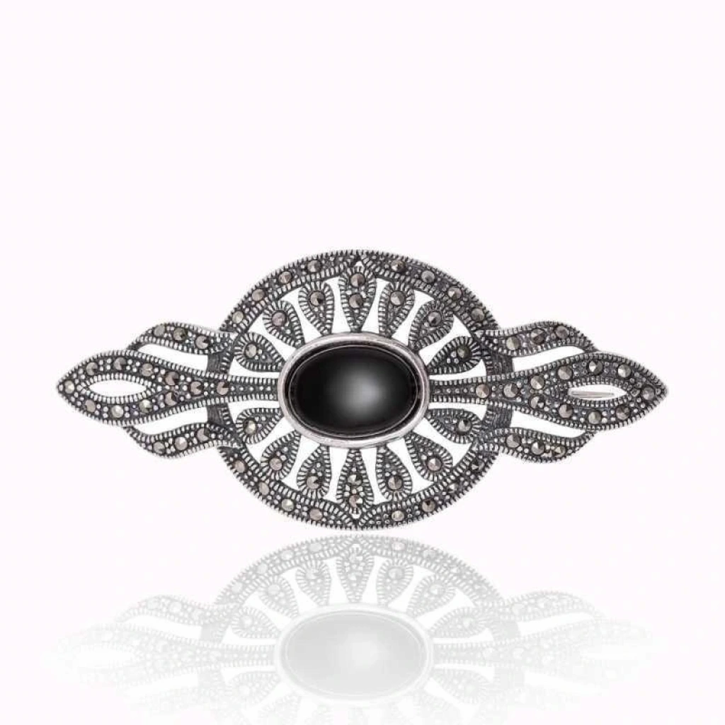 Şık üzeri markazit ve oniks taşlı gümüş broş ışıltısı sizi de sarsın. Kombinlerinizin tamamlayıcısı olacak broşlar özel günlerde tercih edebileceğiniz hediye seçeneklerindendir. 925 ayar gümüşten imal edilmiştir. Üzerinde bulunan taşlar markazittir. Ürünlerimizin tamamı el emeği ile üretilmiştir. Gümüş ve değerli taşlar nedeniyle ürün ağırlığında ± %5 sapma olabilmektedir.