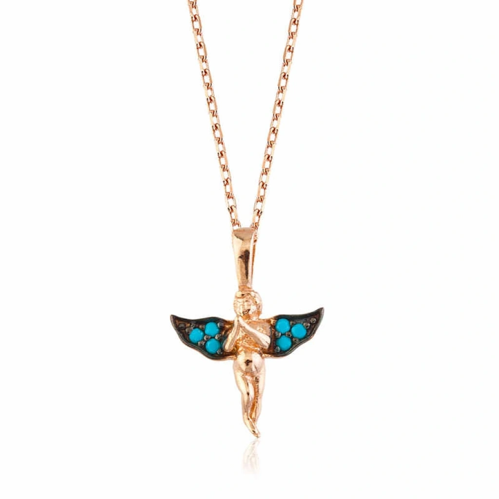 Melekler saflığın ve temizliğin simgeleridir. Bu nedenle melek kolye hediye edilen kişiye melek kadar saf ve temiz olduğu mesajı verilmektedir... Melek kolye; sevgilinize doğum günü , sevgililer günü yada özel günlerde hediye ederek onları mutlu edebilirsiniz... Bu özel melek tasarımı 925 ayar gümüşten imal edilmiştir... Tasarım melek kanadı kolye üzerinde bulunan taşlar firuzedir. Bu gümüş kolye üzerine rose kaplama yapılmıştır. Rose kaplama yapılan tüm kolyeler parlaklığını uzun süre muhafaza eder, gümüşe pembe rengi verir , oksitlenmeyi geciktirir. Zincir boyu ortalama 45 cm'dir. Tüm gümüş kolyelerde olduğu gibi bu gümüş melek kolye de el emeği ile üretilmiştir. Gümüş ve değerli taşlar nedeniyle ürün ağırlığında ± %10 sapma olabilmektedir.