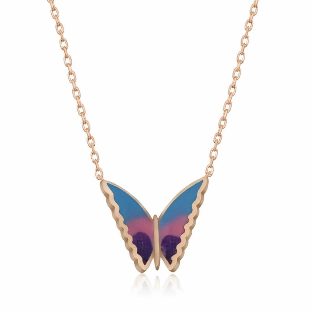 Özgürlüğü masumiyeti ve saflığı simgeleyen kelebekler, tertemiz sevginin ve aşkın ifadesidir. Bahar kelebekleri kolye anlam itibari ile aşkın küçük bir kıvılcım ile başladığı daha sonra büyük bir sabır ile büyüdüğü ve en sonunda ilan-ı aşkı ifade eder. Sizin olduğu kadar sevdiklerinizin de keyifle takacağı minimal kelebek bayan kolye en güzel hediyelerden biri olacaktır. Kolye 925 ayar gümüşten imal edilmiştir. Gümüş üzerine rose kaplama yapılmıştır. Rose kaplama yapılan gümüş bayan kolyeler parlaklığını uzun süre muhafaza eder, ve oksitlenmeyi geciktirir. Kolye üzerinde bulunan renkler mine işlemesidir. Gümüş olan zincir boyu ortalama 45 cm'dir. Tüm gümüş bayan kolyelerde olduğu gibi gümüş minimal kelebek bayan kolye de el emeği ile üretilmiştir. Gümüş ve değerli taşlar nedeniyle belirtilen ürün ağırlığında ± %10 sapma olabilmektedir.