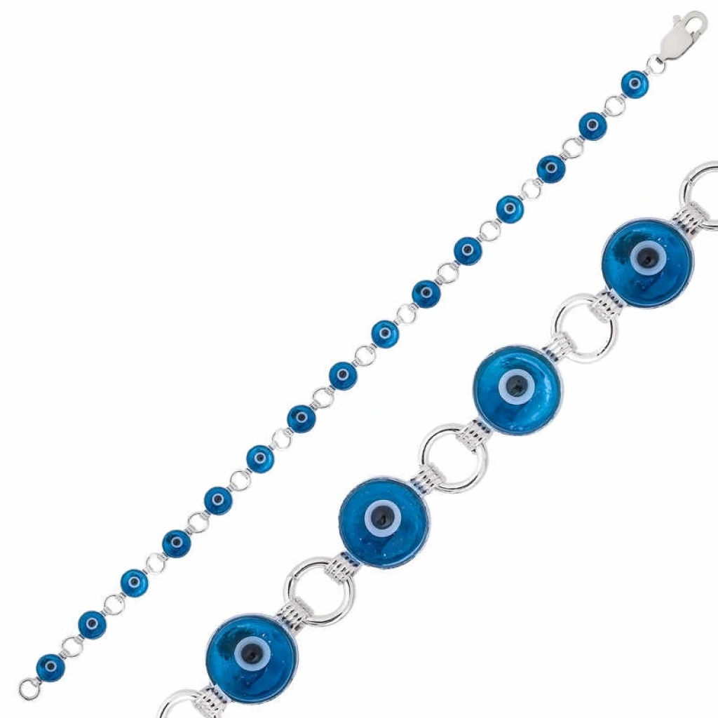 Nazar boncuğunu insanlar uzun yıllardan beri kötü bakıştan korunmak için kullanmışlardır. Kötü bakışların insanlar üzerinde olumsuz etki oluşturmasına karşı bir önlemdir nazar boncuğu… Bu sebeptendir ki insanlar sevdiklerini korumak için nazar boncuğu takmaktadır. Bu nazar bileklik de şıklığı ve zarafeti yansıtıyor. Her dönem sevilen ve şıklığından ödün vermeyen bu modeli; doğum günü hediyesi, sevgililer günü hediyesi veya annelere hediye olarak özel günlerde tercih edebilirsiniz. Gümüş nazar bayan bileklik, 925 ayar gümüşten imal edilmiştir. Gümüş üzerine rodyum kaplama yapılmıştır. Rodyum kaplama yapılan gümüş bayan bileklikler parlaklığını uzun süre muhafaza eder, oksitlenmesi gecikir. Üzerinde bulunan taşlar camdır. Tüm gümüş bayan bilekliklerinde olduğu gibi bu gümüş nazar bayan bileklik modeli de tamamı el emeği ile üretilmiştir. Gümüş ve değerli taşlar nedeniyle belirtilen ortalama ürün ağırlığında ± %10 sapma olabilmektedir.