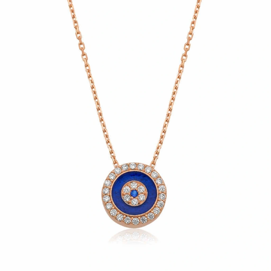 Birçok kültürde kötü enerjinin zararlarından korunmak için çeşitli tılsımlar kullanılmıştır. Doğu kültürlerinin çoğunda kullanılan tılsım ise gözdür. Nazar boncuğu da göz şeklinden ilhamla tasarlanmıştır. Mavi rengin seçilmesi de tesadüf değildir. Renkli gözlü kişilerin enerjisini daha etkili yansıttığı inancı gereği nazar boncukları çoğunlukla mavi olarak tasarlanır. Güzelliğiyle göz kamaştıran, nazardan korunmasını istediğiniz kişilere ve sevdiklerinize nazar kolyeyi armağan edebilirsiniz. Nazar kolye modeli 925 ayar gümüşten imal edilmiştir. Gümüş üzerine rose altın kaplama yapılmıştır. Rose altın kaplama yapılan gümüş nazar kolye modelleri parlaklığını uzun süre muhafaza eder ve oksitlenmesi gecikir. Kolye üzerinde bulunan taşlar zirkon'dur. Bu nazar kolye modeli diğer tüm gümüş kolye modellerinde olduğu gibi el emeği ile üretilmiştir. Gümüş ve değerli taşlar nedeniyle belirtilen ortalama ürün ağırlığında ± %10 sapma olabilmektedir.