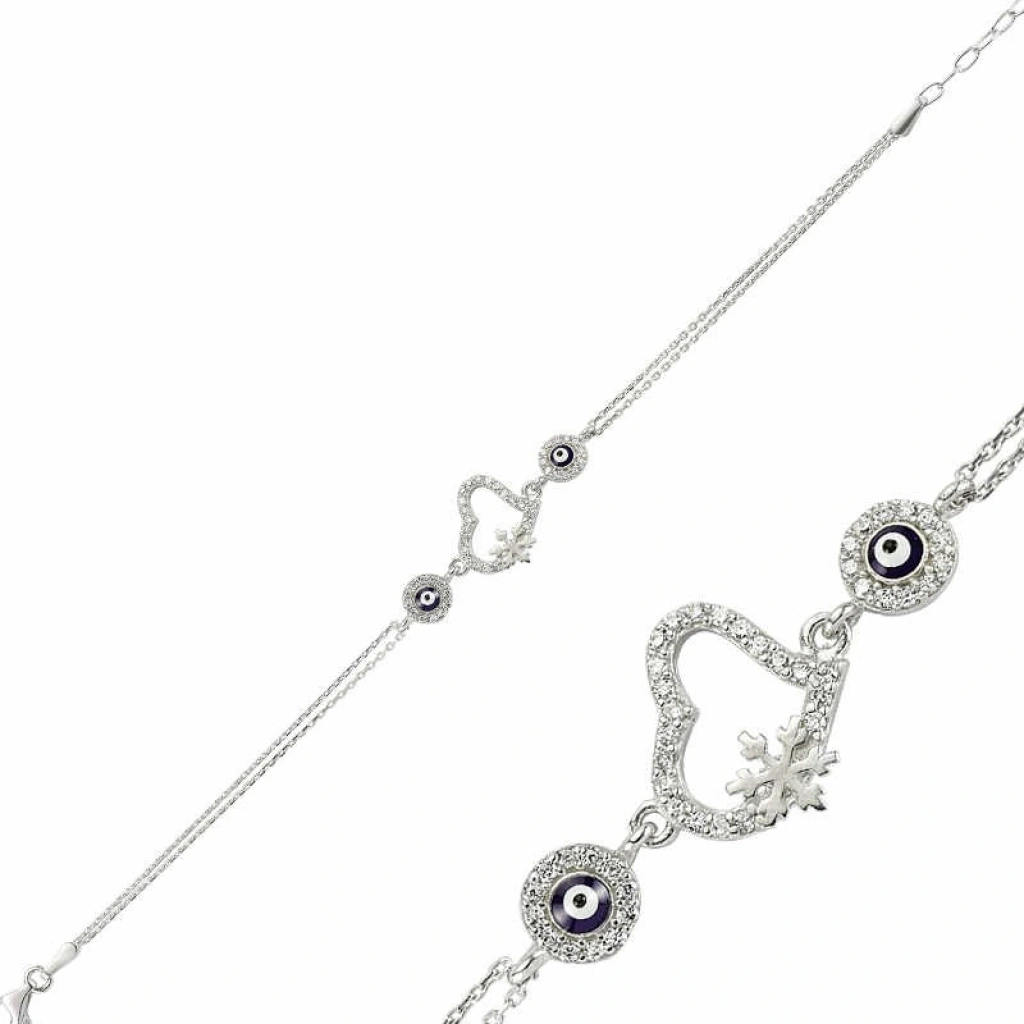 Gümüş Nazarlı Kar Tanesi Kalp Bileklik