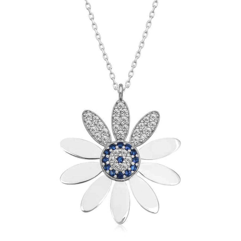 Papatya çiçeği temiz sevgi anlamını ifade eder. En büyük özelliklerinden biri her sapında bir tane olmasıdır. Bu güzellik tasarlanarak ortaya çıkan bu ışıl ışıl kolye zirkon taşlarla süslendi... Bu şık kolye; doğum günü hediyesi, sevgililer günü hediyesi veya annelere hediye olarak özel günlerde tercih edilebilecek mükemmel bir seçenektir. Gümüş nazar papatya kadın kolye 925 ayar gümüşten imal edilmiştir. Bu kolye üzerinde rodyum kaplama vardır. Rodyum kaplama yapılan ürünler parlaklığını uzun süre muhafaza eder. Üzerinde bulunan ışıl ışıl taşlar zirkondur. Tüm gümüş kadın kolye modellerinde olduğu gibi gümüş nazarlı papatya kadın kolye modeli de el emeği ile üretilmiştir. Gümüş ve değerli taşlar nedeniyle belirtilen ortalama ürün ağırlığında ± %10 sapma olabilmektedir.